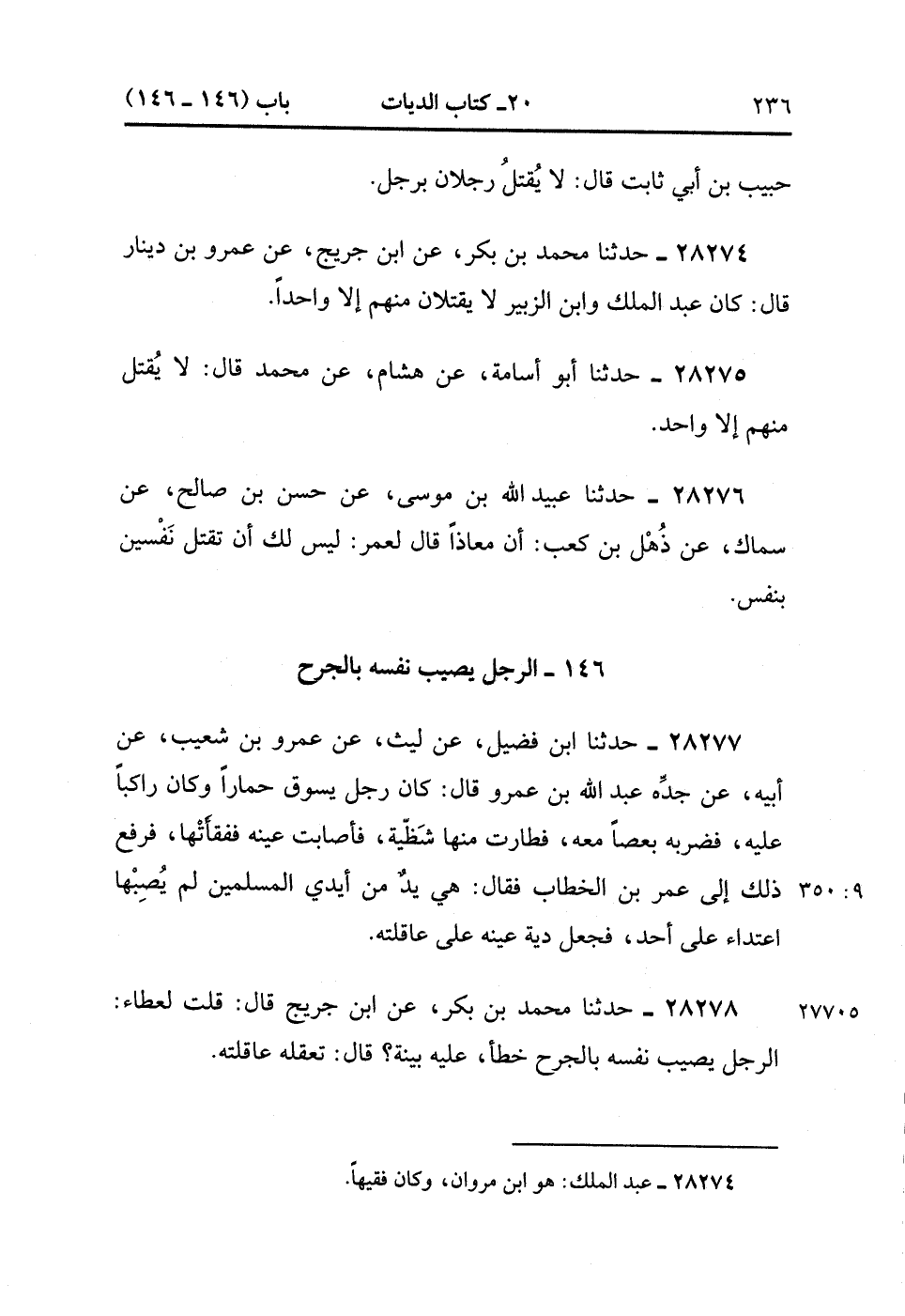 28276- حَدَّثَنَا عُبَيْدُ اللهِ بْنُ مُوسَى ، عَنْ حَسَنِ بْنِ صَالِحٍ ، عَنْ سِمَاكٍ ، عَنْ ذُهْلِ بْنِ كَعْبٍ ؛ أَنَّ مُعَاذًا قَالَ لِعُمَرَ : لَيْسَ لَكَ أَنْ تَقْتُلَ نَفْسَيْنِ بِنَفْسٍ.