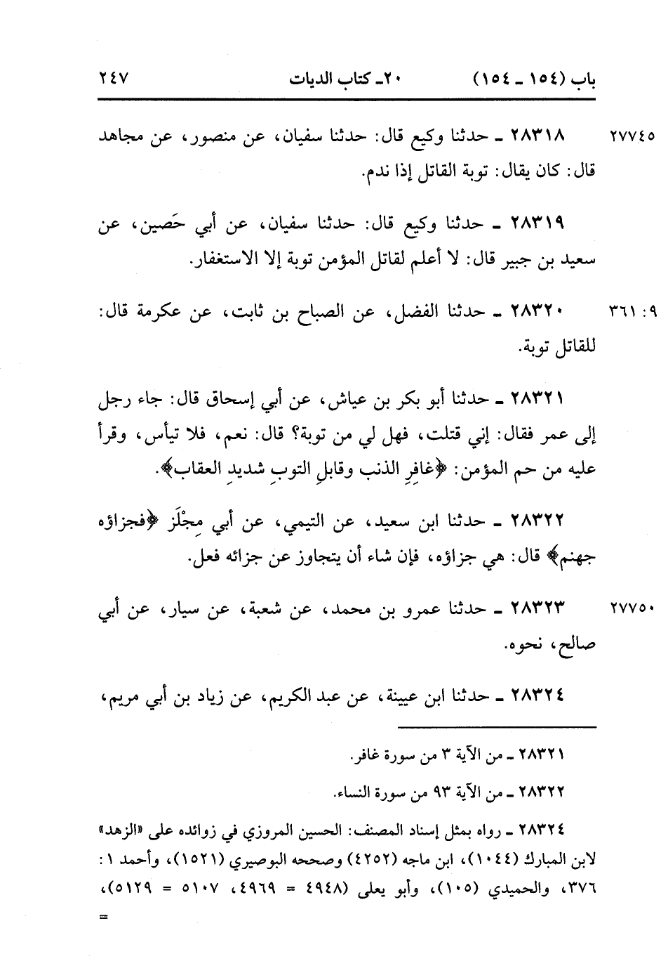 28319- حَدَّثَنَا وَكِيعٌ , قَالَ : حدَّثَنَا سُفْيَانُ ، عَنْ أَبِي حَصِينٍ ، عَنْ سَعِيدِ بْنِ جُبَيْرٍ ، قَالَ : لاَ أَعْلَمُ لِقَاتِلِ الْمُؤْمِنِ تَوْبَةً ، إِلاَّ الاِسْتِغْفَارُ. (9/360).