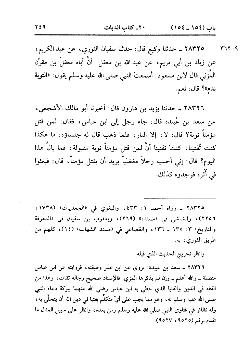 28326- حَدَّثَنَا يَزِيدُ بْنُ هَارُونَ , قَالَ : أَخْبَرَنَا أَبُو مَالِكٍ الأَشْجَعِيُّ ، عَنْ سَعْدِ بْنِ عُبَيْدَةَ ، قَالَ : جَاءَ رَجُلٌ إِلَى ابْنِ عَبَّاسٍ فَقَالَ : لِمَنْ قَتَلَ مُؤْمِنًا تَوْبَةٌ ؟ قَالَ : لاَ ، إِلاَّ النَّارُ ، فَلَمَّا ذَهَبَ قَالَ لَهُ جُلَسَاؤُهُ : مَا هَكَذَا كُنْتَ تُفْتِينَا ، كُنْتَ تُفْتِينَا أَنَّ لِمَنْ قَتَلَ مُؤْمِنًا تَوْبَةٌ مَقْبُولَةٌ ، فَمَا بَالُ الْيَوْمِ ؟ قَالَ : إِنِّي أَحْسِبُهُ رَجُلاً مُغْضَبًا يُرِيدُ أَنْ يَقْتُلَ مُؤْمِنًا ، قَالَ : فَبَعَثُوا فِي أَثَرِهِ فَوَجَدُوهُ كَذَلِكَ. (9/362).