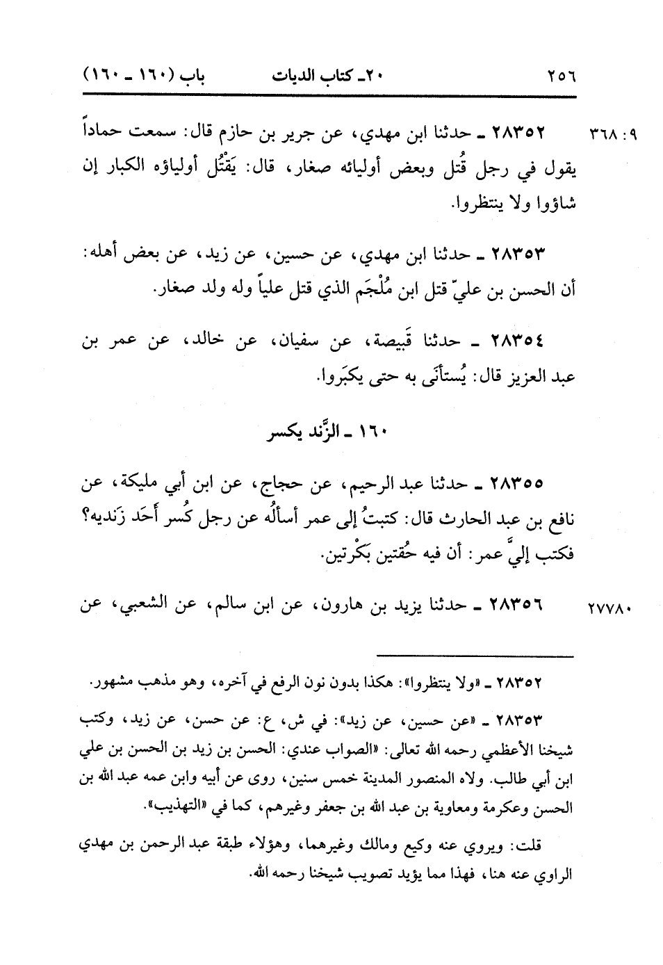 28352- حَدَّثَنَا ابْنُ مَهْدِيٍّ ، عَنْ جَرِيرِ بْنِ حَازِمٍ ، قَالَ : سَمِعْتُ حَمَّادًا يَقُولُ فِي رَجُلٍ قُتِلَ ، وَبَعْضُ أَوْلِيَائِهِ صِغَارٌ ، قَالَ : يَقْتُلُ أَوْلِيَاؤُهُ الْكِبَارُ إِنْ شَاؤُوا ، وَلاَ يَنْتَظِرُوا.