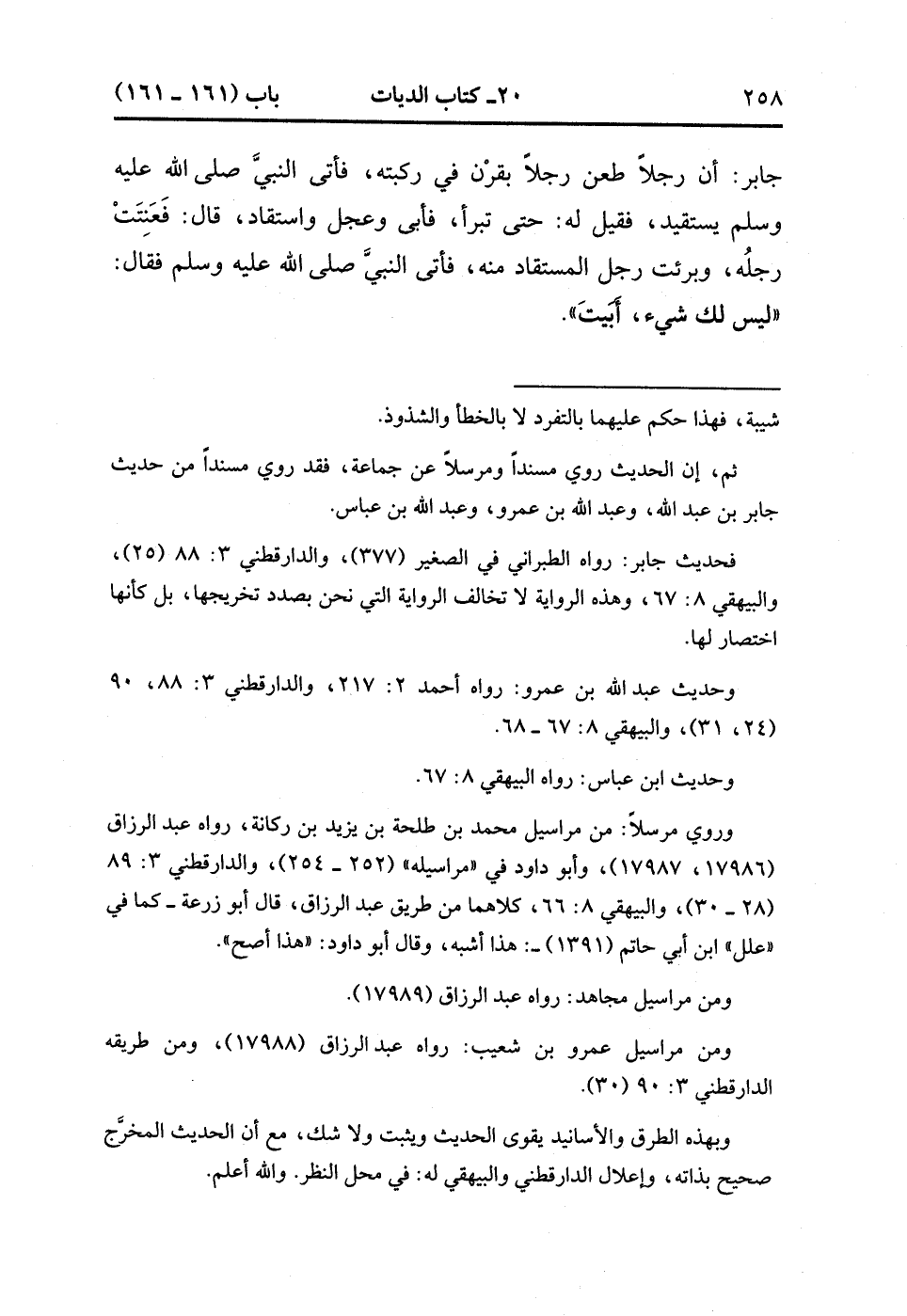 28360- حَدَّثَنَا ابْنُ عُلَيَّةَ ، عَنْ أَيُّوبَ ، عَنْ عَمْرِو بْنِ دِينَارٍ ، عَنْ جَابِرٍ ؛ أَنَّ رَجُلاً طَعَنَ رَجُلاً بِقَرْنٍ فِي رُكْبَتِهِ ، فَأَتَى النَّبِيَّ صَلَّى الله عَلَيْهِ وَسَلَّمَ يَسْتَقِيدُ ، فَقِيلَ لَهُ : حتَّى تَبْرَأَ ، فَأَبَى وَعَجَّلَ وَاسْتَقَادَ ، قَالَ : فَعَنِتَتْ رِجْلُهُ وَبَرِئَتْ رِجْلُ الْمُسْتَقَادِ مِنْهُ ، فَأَتَى النَّبِيَّ صَلَّى الله عَلَيْهِ وَسَلَّمَ ، فَقَالَ : لَيْسَ لَكَ شَيْءٌ ، أَبَيْتَ. (9/369).