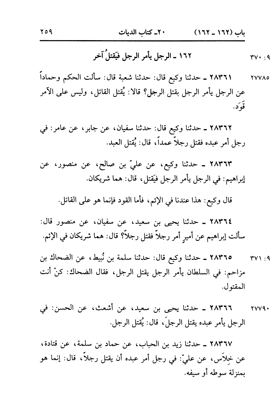 28364- حَدَّثَنَا يَحْيَى بْنُ سَعِيدٍ ، عَنْ سُفْيَانَ ، عَنْ مَنْصُورٍ ، قَالَ : سَأَلْتُ إِبْرَاهِيمَ عَنْ أَمِيرٍ أَمَرَ رَجُلاً فَقَتَلَ رَجُلاً ؟ قَالَ : هُمَا شَرِيكَانِ فِي الإِثْمِ. (9/370).
