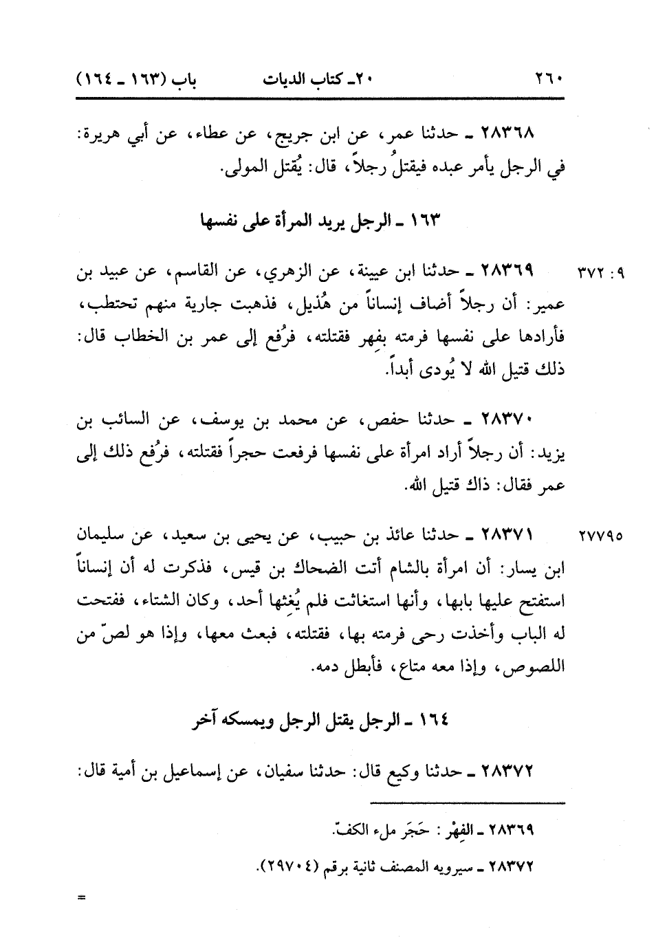 28369- حَدَّثَنَا ابْنُ عُيَيْنَةَ ، عَنِ الزُّهْرِيِّ ، عَنِ الْقَاسِمِ ، عَنْ عُبَيْدِ بْنِ عُمَيْرٍ ؛ أَنَّ رَجُلاً أَضَافَ إِنْسَانًا مِنْ هُذَيْلٍ ، فَذَهَبَتْ جَارِيَةٌ مِنْهُمْ تَحْتَطِبُ ، فَأَرَادَهَا عَلَى نَفْسِهَا ، فَرَمَتْهُ بِفِهْرٍ فَقَتَلَتْهُ ، فَرُفِعَ إِلَى عُمَرَ بْنِ الْخَطَّابِ ، قَالَ : ذَلِكَ قَتِيلُ اللهِ ، لاَ يُودَى أَبَدًا. (9/371).