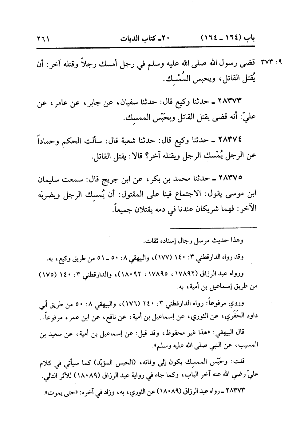28372- حَدَّثَنَا وَكِيعٌ , قَالَ : حدَّثَنَا سُفْيَانُ ، عَنْ إِسْمَاعِيلَ بْنِ أُمَيَّةَ ، قَالَ : قَضَى رَسُولُ اللهِ صَلَّى الله عَلَيْهِ وَسَلَّمَ فِي رَجُلٍ أَمْسَكَ رَجُلاً وَقَتَلَهُ آخَرُ ، أَنْ يُقْتَلَ الْقَاتِلُ ، وَيُحْبَسَ الْمُمْسِكُ. (9/372).