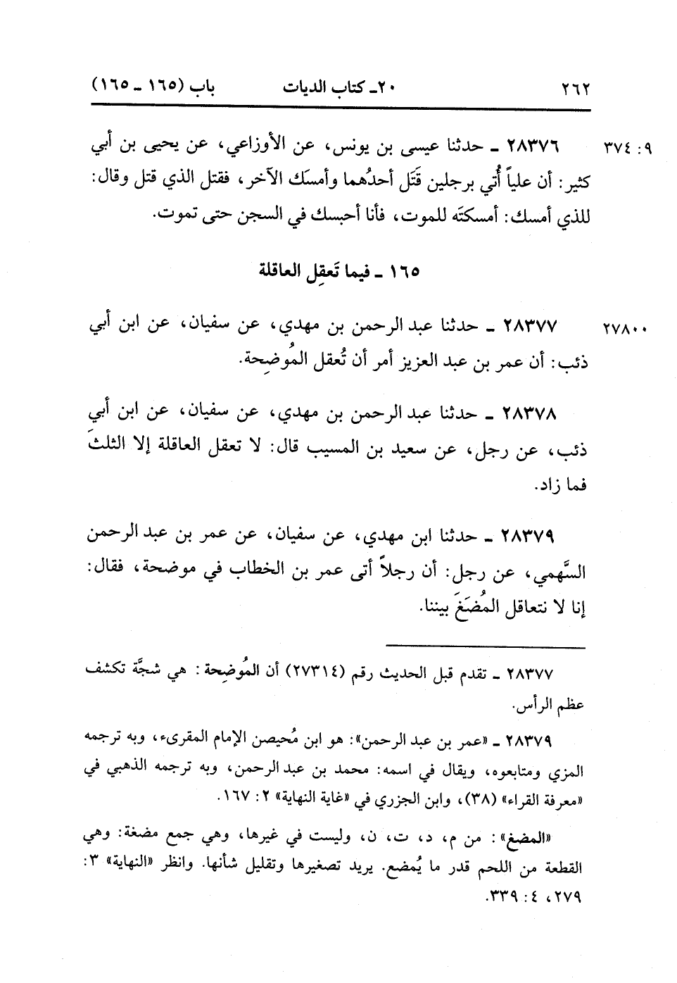 28379- حَدَّثَنَا ابْنُ مَهْدِيٍّ ، عَنْ سُفْيَانَ ، عَنْ عُمَرَ بْنِ عَبْدِ الرَّحْمَنِ السَّهْمِيِّ ، عَنْ رَجُلٍ ؛ أَنَّ رَجُلاً أَتَى عُمَرَ بْنَ الْخَطَّابِ فِي مُوضِحَةٍ ؟ فَقَالَ : إِنَّا لاَ نَتَعَاقَلُ الْمُضَغَ بَيْنَنَا. (9/374).