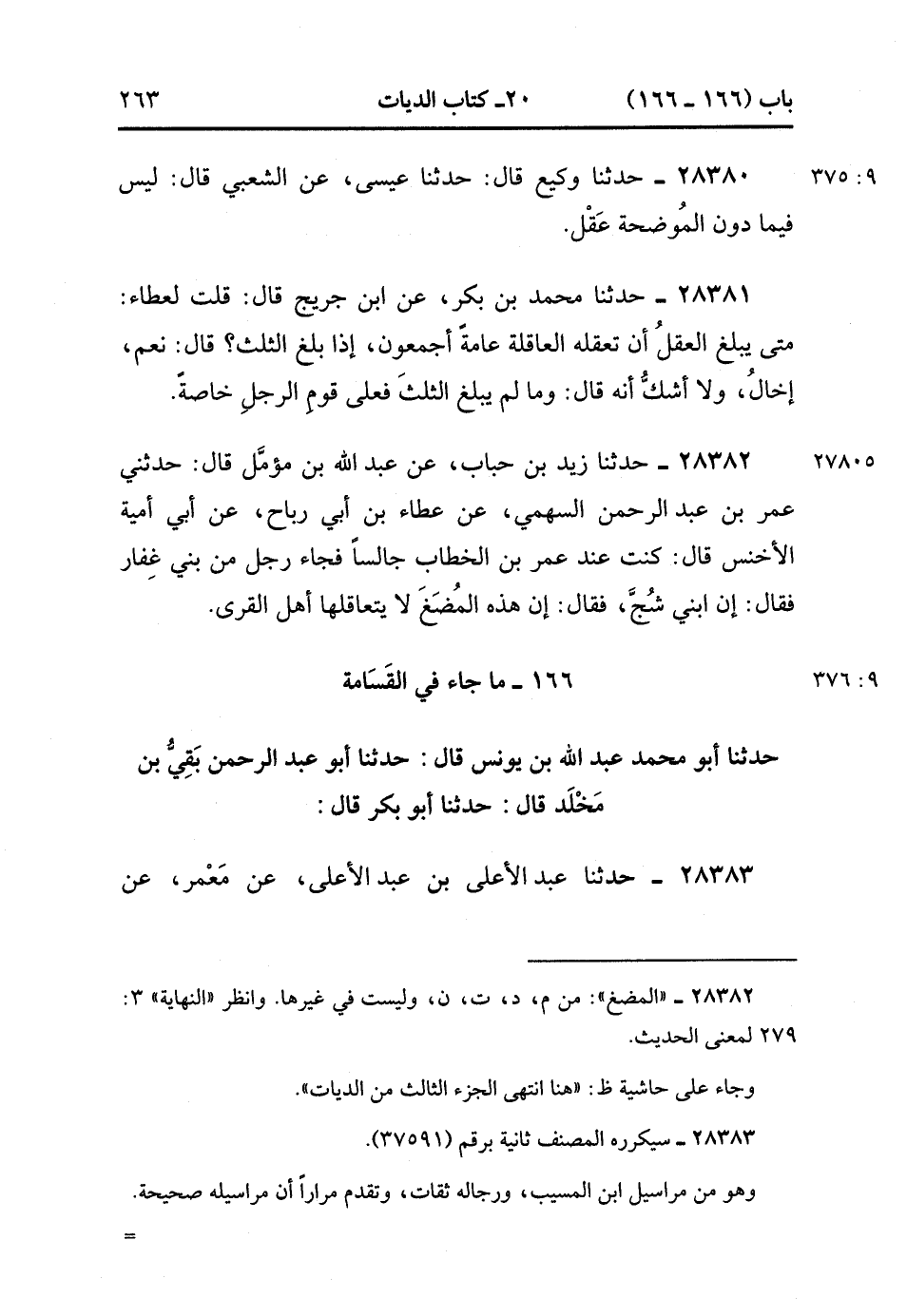 28382- حَدَّثَنَا زَيْدُ بْنُ حُبَابٍ ، عَنْ عَبْدِ اللهِ بْنِ مُؤَمِّلٍ ، قَالَ : حدَّثَنِي عُمَرُ بْنُ عَبْدِ الرَّحْمَنِ السَّهْمِيُّ ، عَنْ عَطَاءِ بْنِ أَبِي رَبَاحٍ ، عَنْ أَبِي أُمَيَّةَ الأَخْنَسِ ، قَالَ : كُنْتُ عَندَ عُمَرَ بْنِ الْخَطَّابِ جَالِسًا ، فَجَاءَ رَجُلٌ مِنْ بَنِي غِفَارٍ ، فَقَالَ : إِنَّ ابْنِي شُجَّ ، فَقَالَ : إِنَّ هَذِهِ الْمُضَغ لاَ يَتَعَاقَلُهَا أَهْلُ الْقُرَى.(9/375).