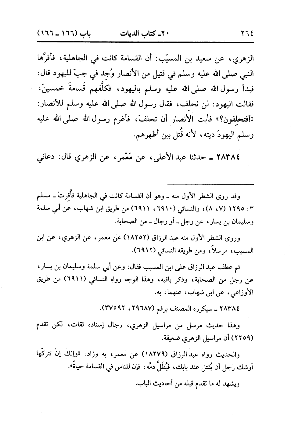 28384- حَدَّثَنَا عَبْدُ الأَعْلَى ، عَنْ مَعْمَرٍ ، عَنِ الزُّهْرِيِّ ، قَالَ : دَعَانِي عُمَرُ بْنُ عَبْدِ الْعَزِيزِ فَسَأَلَنِي عَنِ الْقَسَامَةِ ؟ فَقَالَ : قَدْ بَدَا لِي أَنْ أَرُدَّهَا ، إِنَّ الأَعْرَابِيَّ يَشْهَدُ ، وَالرَّجُلُ الْغَائِبُ يَجِيءُ فَيَشْهَدُ ، فَقُلْتُ : يَا أَمِيرَ الْمُؤْمِنِينَ ، إِنَّك لَنْ تَسْتَطِيعَ رَدَّهَا ، قَضَى بِهَا رَسُولُ اللهِ صَلَّى الله عَلَيْهِ وَسَلَّمَ وَالْخُلَفَاءُ بَعْدَهُ. (9/376).
