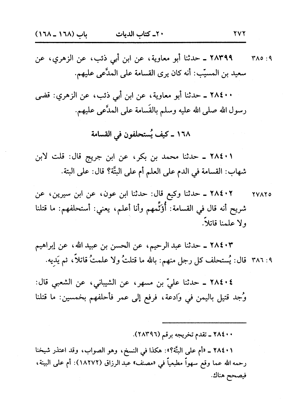 28403- حَدَّثَنَا عَبْدُ الرَّحِيمِ ، عَنِ الْحَسَنِ بْنِ عُبَيْدِ الله ، عَنْ إِبْرَاهِيمَ ، قَالَ : يُسْتَحْلفُ كُلُّ رَجُلٍ مِنْهُمْ بِاللَّهِ : مَا قَتَلْتُ ، وَلاَ عَلِمْتُ قَاتِلاً ، ثُمَّ يَدِيهِ. (9/385).
