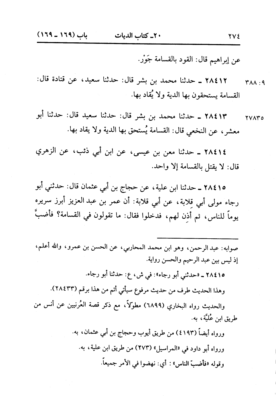 28412- حَدَّثَنَا مُحَمَّدُ بْنُ بِشْرٍ , قَالَ : حدَّثَنَا سَعِيدٌ ، عَنْ قَتَادَةَ ، قَالَ : الْقَسَامَةُ يَسْتَحِقُّونَ بِهَا الدِّيَةَ ، وَلاَ يُقَادُ بِهَا. (9/387).