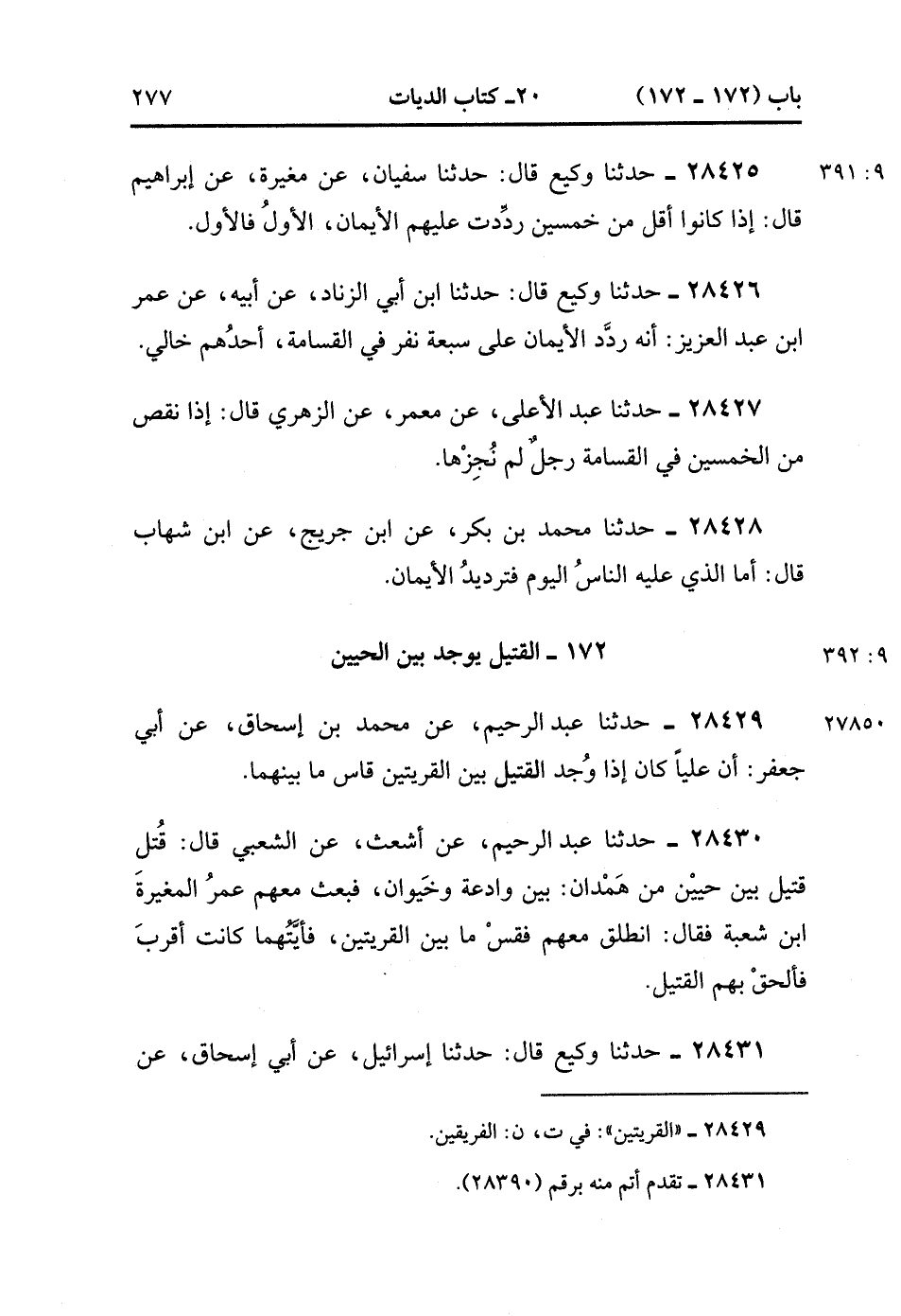 28431- حَدَّثَنَا وَكِيعٌ , قَالَ : حدَّثَنَا إِسْرَائِيلُ ، عَنْ أَبِي إِسْحَاقَ ، عَنِ الْحَارِثِ بْنِ الأَزْمَعِ ، قَالَ : وُجِدَ قَتِيلٌ بِالْيَمَنِ بَيْنَ وَادِعَةَ وَأَرْحَبَ ، فَكَتَبَ عَامِلُ عُمَرَ إِلَيْهِ ، فَكَتَبَ إِلَيْهِ عُمَرُ : أَنْ قِسْ مَا بَيْنَ الْحَيَّيْنِ ، فَإِلَى أَيِّهِمَا كَانَ أَقْرَبَ فَخُذْهُمْ بِهِ. (9/392).
