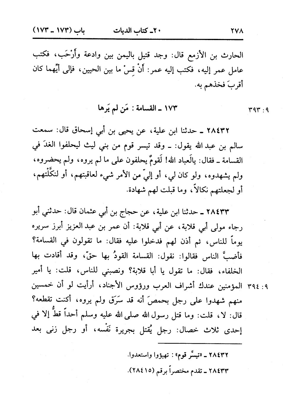 28433- حَدَّثَنَا ابْنُ عُلَيَّةَ ، عَنْ حَجَّاجِ بْنِ أَبِي عُثْمَانَ ، قَالَ : حدَّثَنَي أَبُو رَجَاءٍ ، مَوْلَى أَبِي قِلاَبَةَ ، عَنْ أَبِي قِلاَبَةَ ؛ أَنَّ عُمَرَ بْنَ عَبْدِ الْعَزِيزِ أَبْرَزَ سَرِيرَهُ يَوْمًا لِلنَّاسِ ، ثُمَّ أَذِنَ لَهُمْ فَدَخَلُوا عَلَيْهِ ، فَقَالَ : مَا تَقُولُونَ فِي الْقَسَامَةِ ؟ فَأَضَبَّ النَّاسُ ، فَقَالُوا : نَقُولُ : الْقَسَامَةُ الْقَوَدُ بِهَا حَقٌّ ، وَقَدْ أَقَادَتْ بِهَا الْخُلَفَاءُ ، فَقَالَ : مَا تَقُولُ يَا أَبَا قِلاَبَةَ ؟ وَنَصَبَنِي لِلنَّاسِ ، قُلْتُ : يَا أَمِيرَ الْمُؤْمِنِينَ ، عِنْدَكَ أَشْرَافُ الْعَرَبِ وَرُؤُوسُ الأَجْنَادِ ، أَرَأَيْتَ لَوْ أَنَّ خَمْسِينَ مِنْهُمْ شَهِدُوا عَلَى رَجُلٍ بِحِمْصٍ أَنَّهُ قَدْ سَرَقَ وَلَمْ يَرَوْهُ ، أَكُنْت تَقْطَعُهُ ؟ قَالَ : لاَ ، قُلْتُ : وَمَا قَتَلَ رَسُولُ اللهِ صَلَّى الله عَلَيْهِ وَسَلَّمَ أَحَدًا قَطُّ ، إِلاَّ فِي إِحْدَى ثَلاَثِ خِصَالٍ : رَجُلٍ يُقْتَلُ بِجَرِيرَةِ نَفْسِهِ ، أَوْ رَجُلٍ زَنَى بَعْدَ إِحْصَانِهِ ، أَوْ رَجُلٍ حَارَبَ اللَّهَ وَرَسُولَهُ وَارْتَدَّ عَنِ الإِسْلاَمِ. (9/393).