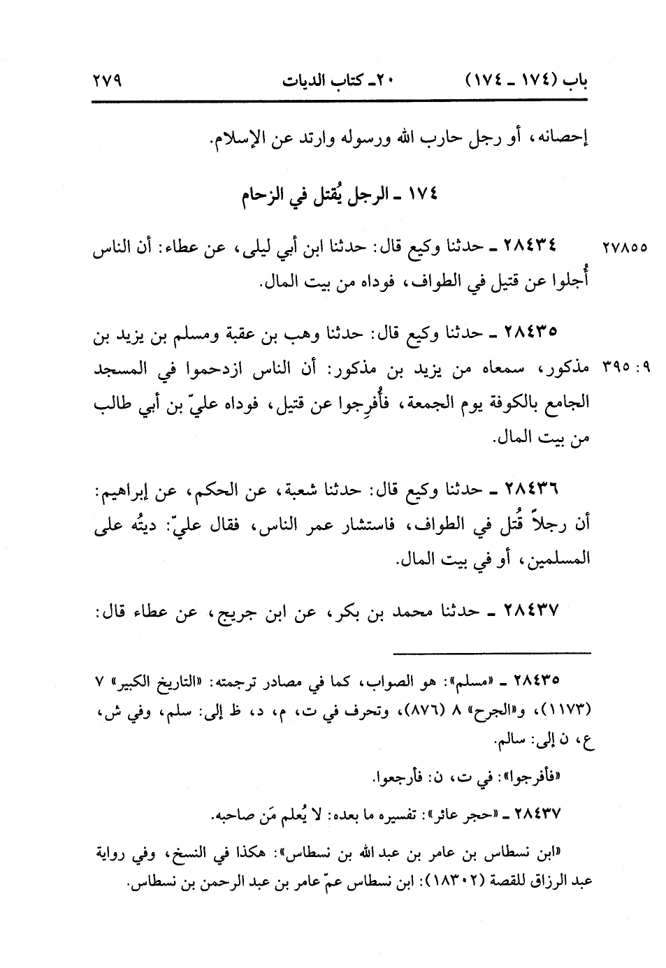 28436- حَدَّثَنَا وَكِيعٌ , قَالَ : حدَّثَنَا شُعْبَةُ ، عَنِ الْحَكَمِ ، عَنْ إِبْرَاهِيمَ ؛ أَنَّ رَجُلاً قُتِلَ فِي الطَّوَافِ ، فَاسْتَشَارَ عُمَرُ النَّاسَ ، فَقَالَ عَلِيٌّ : دِيَتُهُ عَلَى الْمُسْلِمِينَ ، أَوْ فِي بَيْتِ الْمَالِ. (9/395).