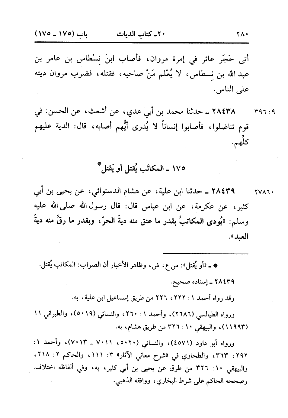 28439- حَدَّثَنَا ابْنُ عُلَيَّةَ ، عَنْ هِشَامٍ الدَّسْتُوَائِيِّ ، عَنْ يَحْيَى بْنِ أَبِي كَثِيرٍ ، عَنْ عِكْرِمَةَ ، عَنِ ابْنِ عَبَّاسٍ ، قَالَ : قَالَ رَسُولُ اللهِ صَلَّى الله عَلَيْهِ وَسَلَّمَ : يُودَى الْمُكَاتَبُ بِقَدْرِ مَا عَتَقَ مِنْهُ دِيَةَ الْحُرِّ ، وَبِقَدْرِ مَا رُقَّ مِنْهُ دِيَةَ الْعَبْدِ. (9/396).