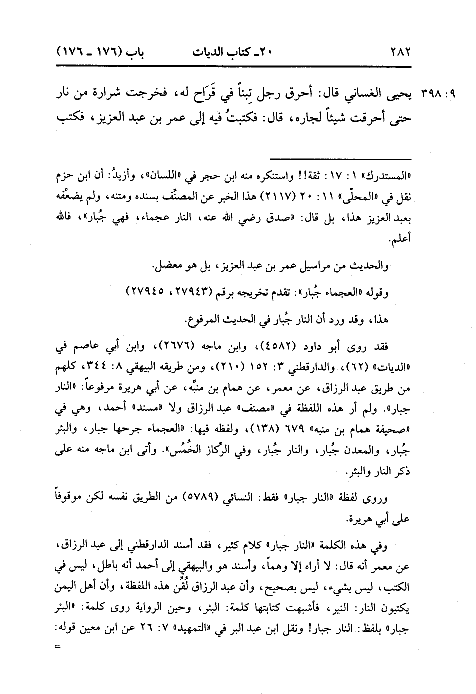 28446- حَدَّثَنَا وَكِيعٌ ، عَنْ عَبْدِ الْعَزِيزِ بْنِ حُصَيْنٍ ، عَنْ يَحْيَى بْنِ يَحْيَى الْغَسَّانِيِّ ، قَالَ : أَحْرَقَ رَجُلٌ تِبْنًا فِي قَرَاحٍ لَهُ ، فَخَرَجَتْ شَرَارَةٌ مِنْ نَارٍ ، حَتَّى أَحْرَقَتْ شَيْئًا لِجَارِهِ ، قَالَ : فَكَتَبْتُ فِيهِ إِلَى عُمَرَ بْنِ عَبْدِ الْعَزِيزِ ، فَكَتَبَ إِلَيَّ : إِنَّ رَسُولَ اللهِ صَلَّى الله عَلَيْهِ وَسَلَّمَ قَالَ : الْعَجْمَاءُ جُبَارٌ ، وَأَرَى أَنَّ النَّارَ جُبَارٌ. (9/397).