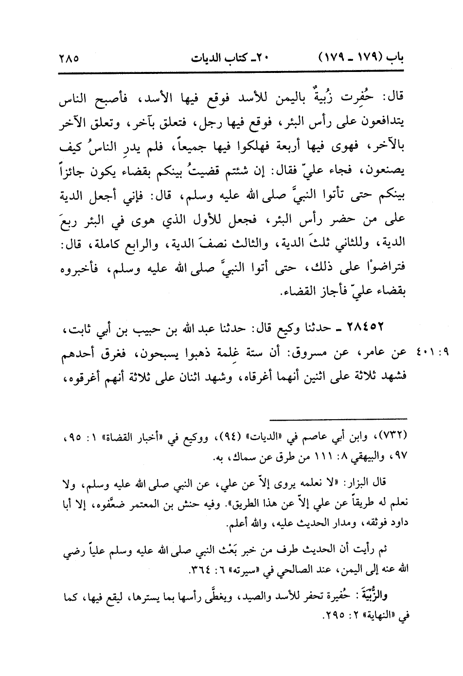 28451- حَدَّثَنَا أَبُو الأَحْوَصِ ، عَنْ سِمَاكٍ ، عَنْ حَنَشِ بْنِ الْمُعْتَمِرِ ، قَالَ : حُفِرَتْ زُبْيَةٌ بِالْيَمَنِ لِلأَسَدِ فَوَقَعَ فِيهَا الأَسَدُ ، فَأَصْبَحَ النَّاسُ يَتَدَافَعُونَ عَلَى رَأْسِ الْبِئْرِ ، فَوَقَعَ فِيهَا رَجُلٌ ، فَتَعَلَّقَ بِآخَرَ ، وَتَعَلَّقَ الآخَرُ بِآخَرَ ، فَهَوَى فِيهَا أَرْبَعَةٌ فَهَلَكُوا فِيهَا جَمِيعًا ، فَلَمْ يَدْرِ النَّاسُ كَيْفَ يَصْنَعُونَ ، فَجَاءَ عَلِيٌّ ، فَقَالَ : إِنْ شِئْتُمْ قَضَيْتُ بَيْنَكُمْ بِقَضَاءٍ يَكُونُ جَائِزًا بَيْنَكُمْ ، حَتَّى تَأْتُوا النَّبِيَّ صَلَّى الله عَلَيْهِ وَسَلَّمَ ، قَالَ : فَإِنِّي أَجْعَلُ الدِّيَةَ عَلَى مَنْ حَضَرَ رَأْسَ الْبِئْرِ ، فَجَعَلَ لِلأَوَّلِ الَّذِي هَوَى فِي الْبِئْرِ رُبُعَ الدِّيَةِ ، وَلِلثَّانِي ثُلُثَ الدِّيَةِ ، وَالثَّالِثِ نِصْفَ الدِّيَةِ ، وَالرَّابِعِ كَامِلَةً ، قَالَ : فَتَرَاضَوْا عَلَى ذَلِكَ حَتَّى أَتَوْا النَّبِيَّ صَلَّى الله عَلَيْهِ وَسَلَّمَ فَأَخْبَرُوهُ بِقَضَاءِ عَلِيٍّ ، فَأَجَازَ الْقَضَاءَ.