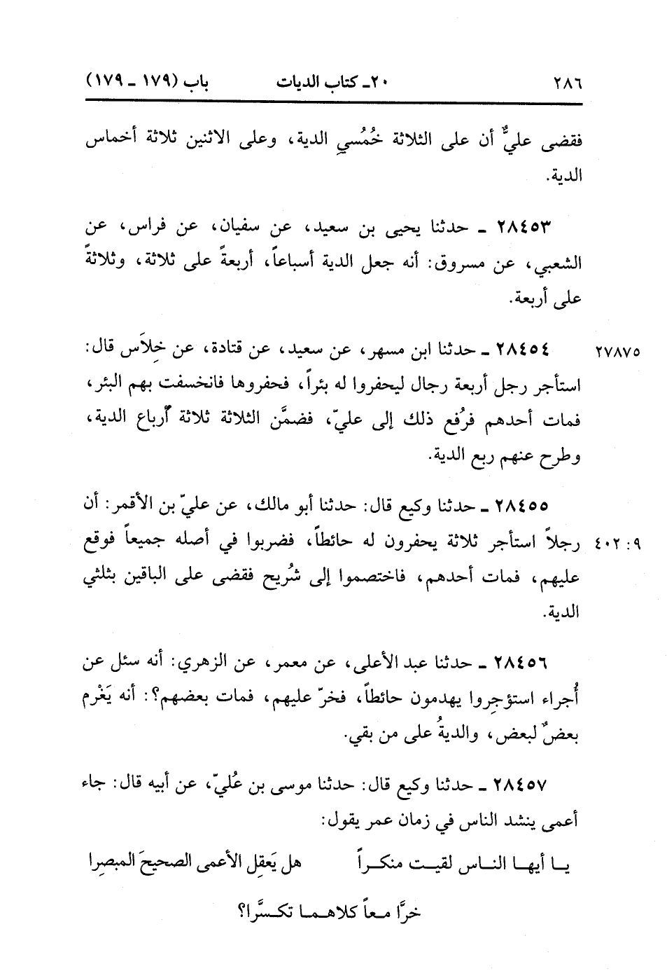 28455- حَدَّثَنَا وَكِيعٌ , قَالَ : حدَّثَنَا أَبُو مَالِكٍ ، عَنْ عَلِيِّ بْنِ الأَقْمَرِ ؛ أَنَّ رَجُلاً اسْتَأْجَرَ ثَلاَثَةً يَحْفِرُونَ لَهُ حَائِطًا ، فَضَرَبُوا فِي أَصْلِهِ جَمِيعًا ، فَوَقَعَ عَلَيْهِمْ فَمَاتَ أَحَدُهُمْ ، فَاخْتَصَمُوا إِلَى شُرَيْحٍ ، فَقَضَى عَلَى الْبَاقِيَيْنِ بِثُلُثَيَ الدِّيَةِ. (9/401).