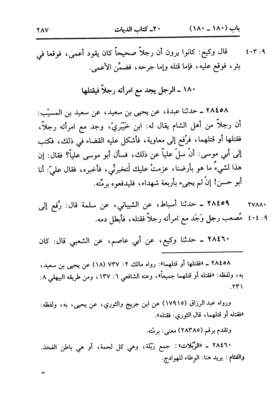 28459- حَدَّثَنَا أَسْبَاطٌ ، عَنِ الشَّيْبَانِيِّ ، عَنْ سَلَمَةَ ، قَالَ : رُفِعَ إِلَى مُصْعَبٍ رَجُلٌ وَجَدَ مَعَ امْرَأَتِهِ رَجُلاً فَقَتَلَهُ ، فَأَبْطَلَ دَمَهُ. (9/403).