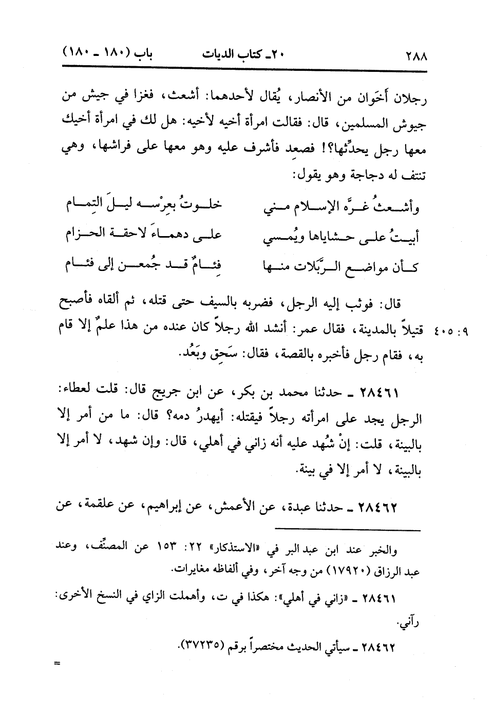 28461- حَدَّثَنَا مُحَمَّدُ بْنُ بَكْرٍ ، عَنِ ابْنِ جُرَيْجٍ ، قَالَ : قُلْتُ لِعَطَاءٍ : الرَّجُلُ يَجِدُ عَلَى امْرَأَتِهِ رَجُلاً فَيَقْتُلُهُ ، أَيُهْدَرُ دَمُهُ ؟ قَالَ : مَا مِنْ أَمْرٍ إِلاَّ بِالْبَيِّنَةِ ، قُلْتُ : إِنْ شُهِدَ عَلَيْهِ أَنَّهُ زَانِي فِي أَهْلِي ، قَالَ : وَإِنْ شُهِدَ ، لاَ أَمْرَ إِلاَّ بِالْبَيِّنَةِ ، لاَ أَمْرَ إِلاَّ فِي بَيِّنَةٍ. (9/405).