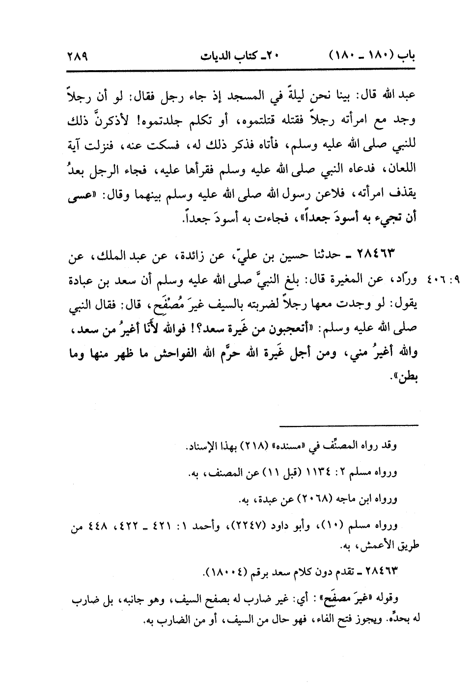 28463- حَدَّثَنَا حُسَيْنُ بْنُ عَلِيٍّ ، عَنْ زَائِدَةَ ، عَنْ عَبْدِ الْمَلِكِ ، عَنْ وَرَّادٍ ، عَنِ الْمُغِيرَةِ ، قَالَ : بَلَغَ النَّبِيَّ صَلَّى الله عَلَيْهِ وَسَلَّمَ أَنَّ سَعْدَ بْنَ عُبَادَةُ يَقُولُ : لَوْ وَجَدْت مَعَهَا رَجُلاً لَضَرَبْتُهُ بِالسَّيْفِ غَيْرَ مُصْفَحٍ ، قَالَ : فَقَالَ النَّبِيُّ صَلَّى الله عَلَيْهِ وَسَلَّمَ : أَتَعْجَبُونَ مِنْ غَيْرَةِ سَعْدٍ ؟ فَوَاللَّهِ لأَنَا أَغْيَرُ مِنْ سَعْدٍ ، وَاللَّهُ أَغْيَرُ مِنِّي ، وَمِنْ أَجْلِ غَيْرَةِ اللهِ حَرَّمَ اللَّهُ الْفَوَاحِشَ ، مَا ظَهَرَ مِنْهَا وَمَا بَطَنَ. (9/405).