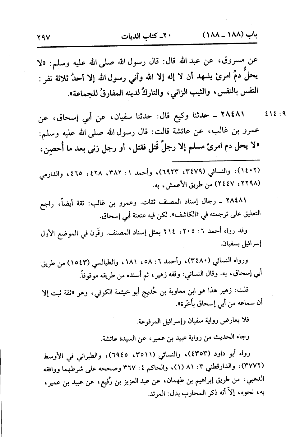 28481- حَدَّثَنَا وَكِيعٌ , قَالَ : حدَّثَنَا سُفْيَانُ ، عَنْ أَبِي إِسْحَاقَ ، عَنْ عَمْرِو بْنِ غَالِبٍ ، عَنْ عَائِشَةَ ، قَالَتْ : قَالَ رَسُولُ اللهِ صَلَّى الله عَلَيْهِ وَسَلَّمَ : لاَ يَحِلُّ دَمُ امْرِئٍ مُسْلِمٍ ، إِلاَّ رَجُلٌ قَتَلَ فَقُتِلَ ، أَوْ رَجُلٌ زَنَى بَعْدَ مَا أُحْصِنَ ، أَوْ رَجُلٌ ارْتَدَّ بَعْدَ إِسْلاَمِهِ. (9/414).