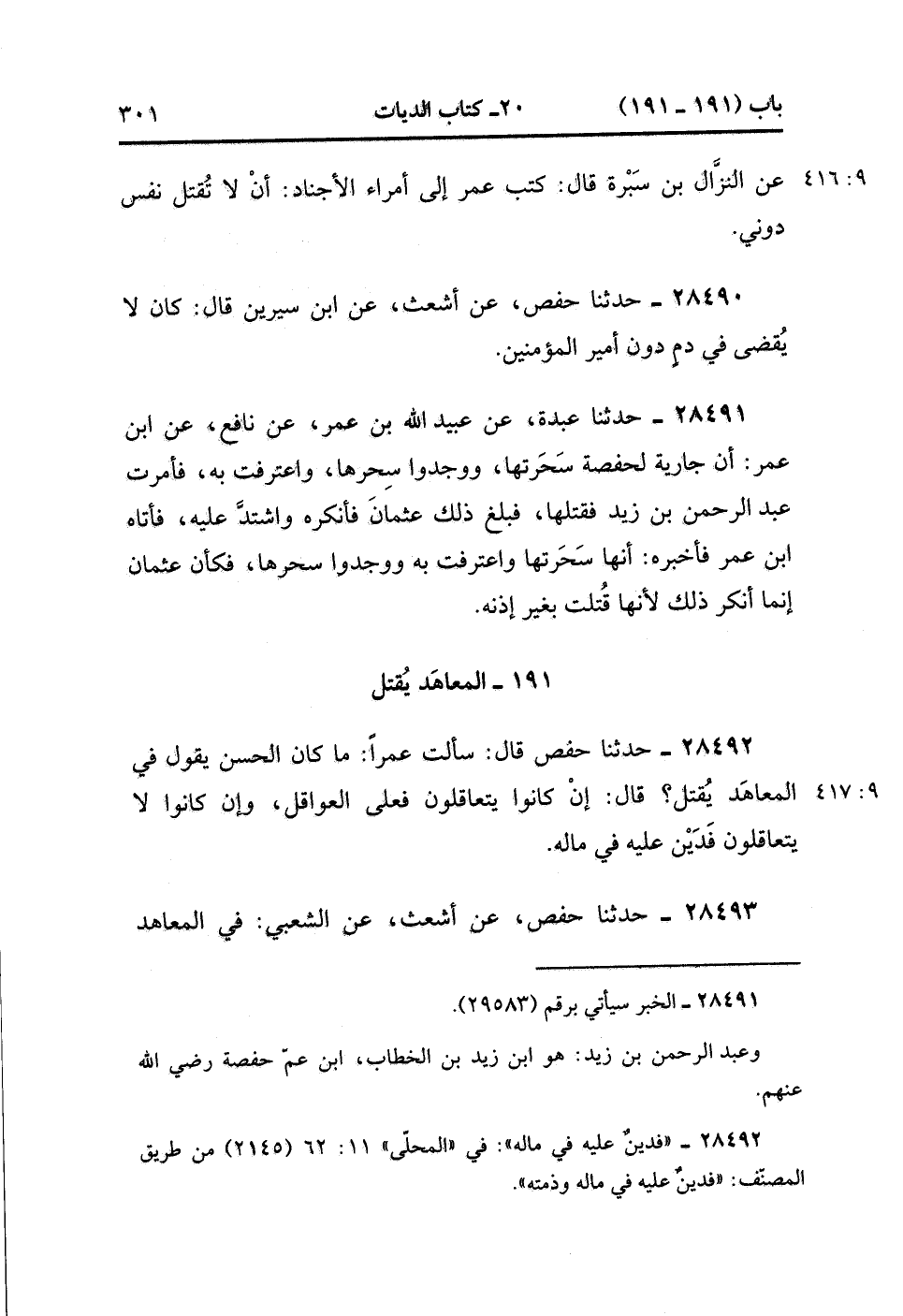 28491- حَدَّثَنَا عَبْدَةُ ، عَنْ عُبَيْدِ اللهِ بْنِ عُمَرَ ، عَنْ نَافِعٍ ، عَنِ ابْنِ عُمَرَ ؛ أَنَّ جَارِيَةً لِحَفْصَةَ سَحَرَتْهَا ، وَوَجَدُوا سِحْرَهَا وَاعْتَرَفَتْ بِهِ ، فَأَمَرْت عَبْدَ الرَّحْمَن بْنَ زَيْدٍ فَقَتَلَهَا ، فَبَلَغَ ذَلِكَ عُثْمَانَ فَأَنْكَرَهُ وَاشْتَدَّ عَلَيْهِ ، فَأَتَاهُ ابْنُ عُمَرَ فَأَخْبَرَهُ أَنَّهَا سَحَرَتْهَا وَاعْتَرَفَتْ بِهِ ، وَوَجَدُوا سِحْرَهَا ، فَكَأَنَّ عُثْمَانَ إِنَّمَا أَنْكَرَ ذَلِكَ لأَنَّهَا قُتِلَتْ بِغَيْرِ إِذْنِهِ.