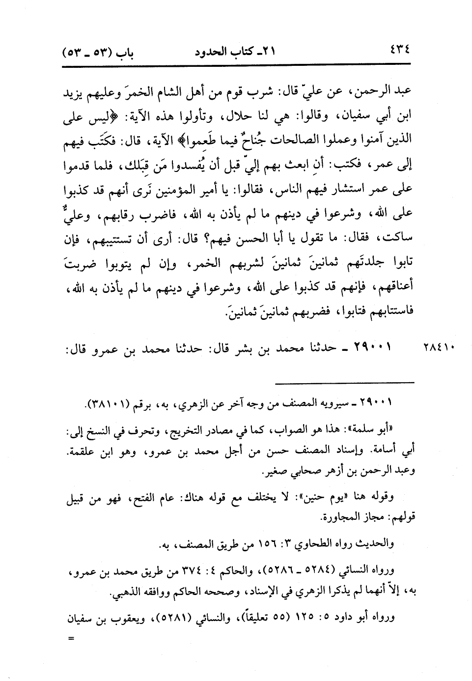 29000- حَدَّثَنَا ابْنُ فُضَيْلٍ ، عَنْ عَطَاءِ بْنِ السَّائِبِ ، عَنْ أَبِي عَبْدِ الرَّحْمَنِ ، عَنْ عَلِيٍّ ، قَالَ : شَرِبَ قَوْمٌ مِنْ أَهْلِ الشَّامِ الْخَمْرَ ، وَعَلَيْهِمْ يَزِيدُ بْنُ أَبِي سُفْيَانَ ، وَقَالُوا : هِيَ لَنَا حَلاَلٌ ، وَتَأَوَّلُوا هَذِهِ الآيَةَ : {لَيْسَ عَلَى الَّذِينَ آمَنُوا وَعَمِلُوا الصَّالِحَاتِ جُنَاحٌ فِيمَا طَعِمُوا} الآيَةَ ، قَالَ : فَكَتَبَ فِيهِمْ إِلَى عُمَرَ ، فَكَتَبَ : أَنِ ابْعَثْ بِهِمْ إِلَيَّ قَبْلَ أَنْ يُفْسِدُوا مَنْ قِبَلِكَ ، فَلَمَّا قَدِمُوا عَلَى عُمَرَ ، اسْتَشَارَ فِيهِمُ النَّاسَ ، فَقَالُوا : يَا أَمِيرَ الْمُؤْمِنِينَ ، نَرَى أَنَّهُمْ قَدْ كَذَبُوا عَلَى اللهِ ، وَشَرَعُوا فِي دِينِهِمْ مَا لَمْ يَأْذَنْ بِهِ اللَّهُ ، فَاضْرِبْ رِقَابَهُمْ ، وَعَلِيٌّ سَاكِتٌ ، فَقَالَ : مَا تَقُولُ يَا أَبَا الْحَسَنِ فِيهِمْ ؟ قَالَ : أَرَى أَنْ تَسْتَتِيبَهُمْ ، فَإِنْ تَابُوا جَلَدْتَهُمْ ثَمَانِينَ لِشُرْبِهم الْخَمْرِ ، وَإِنْ لَمْ يَتُوبُوا ضَرَبْتَ أَعْنَاقَهِمْ ، فَإِنَّهُمْ قَدْ كَذَبُوا عَلَى اللهِ ، وَشَرَعُوا فِي دِينِهِمْ مَا لَمْ يَأْذَنْ بِهِ اللَّهُ ، فَاسْتَتَابَهُمْ فَتَابُوا ، فَضَرَبَهُمْ ثَمَانِينَ ثَمَانِينَ. (9/546).