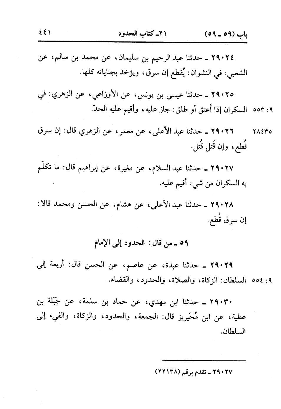 29029- حَدَّثَنَا عَبْدَةُ ، عَنْ عَاصِمٍ ، عَنِ الْحَسَنِ ، قَالَ : أَرْبَعَةٌ إِلَى السُّلْطَانِ ؛ الزَّكَاةُ ، وَالصَّلاَةُ ، وَالْحُدُودُ ، وَالْقَضَاءُ. (9/553).