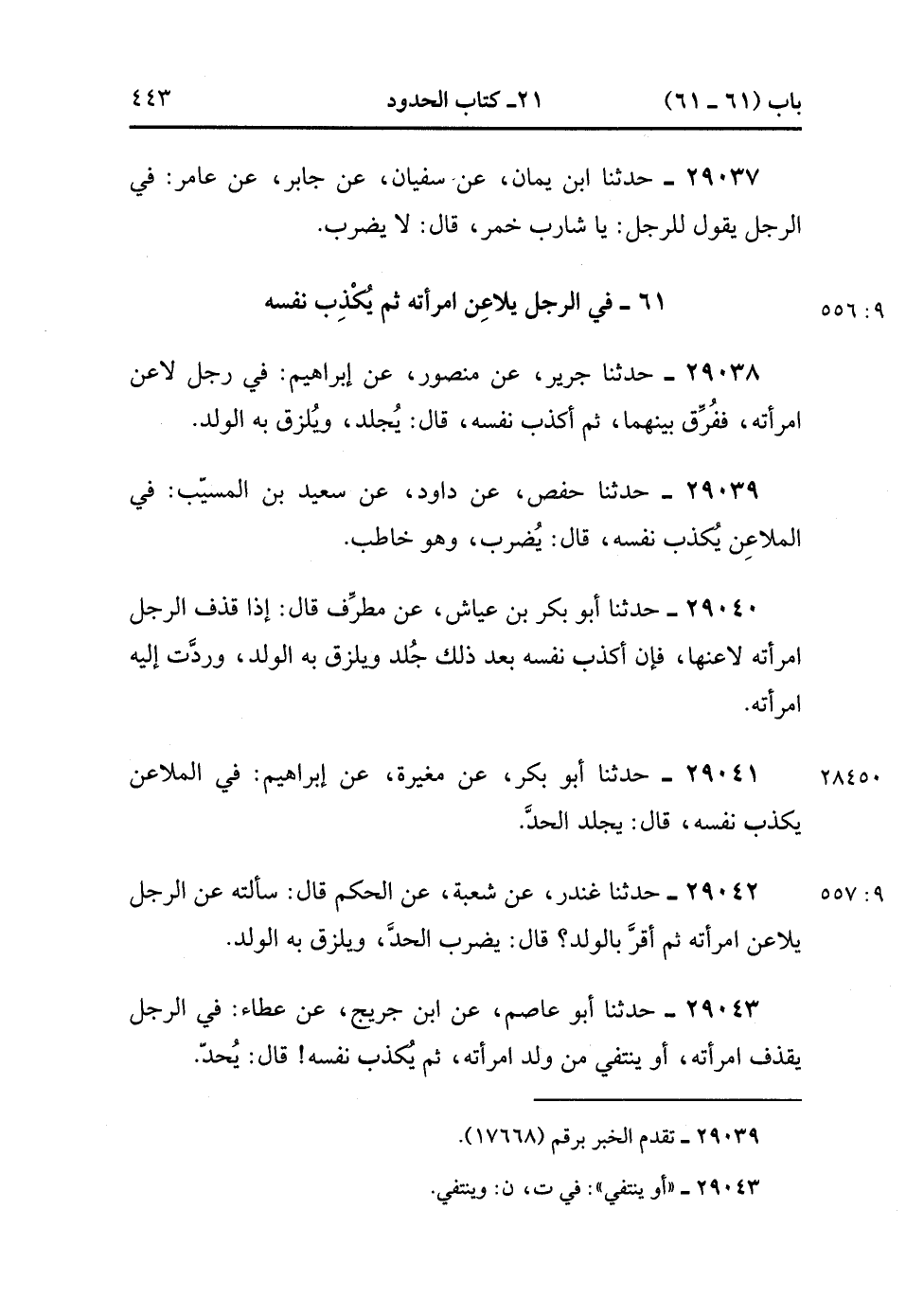 29041- حَدَّثَنَا أَبُو بَكْرٍ ، عَنْ مُغِيرَةَ ، عَنْ إِبْرَاهِيمَ ؛ فِي الْمَلاَعِنِ يُكَذِّبُ نَفْسَهُ ، قَالَ : يُجْلَدُ الْحَدَّ. (9/556).