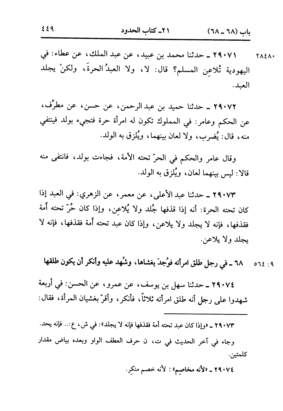 29073- حَدَّثَنَا عَبْدُ الأَعْلَى ، عَنْ مَعْمَرٍ ، عَنِ الزُّهْرِيِّ ؛ فِي الْعَبْدِ إِذَا كَانَ تَحْتَهُ الْحُرَّةُ ، أَنَّهُ إِذَا قَذَفَهَا جُلِدَ ، وَلاَ يُلاَعِنُ ، وَإِذَا كَانَ حُرٌّ تَحْتَهُ أَمَةٌ فَقَذَفَهَا ، فَإِنَّهُ لاَ يُجْلَدُ ، وَلاَ يُلاَعِنُ ، وَإِذَا كَانَ عَبْدٌ تَحْتَهُ أَمَةٌ فَقَذَفَهَا ، فَإِنَّهُ لاَ يُجْلَدُ ، وَلاَ يُلاَعِنُ. (9/563).