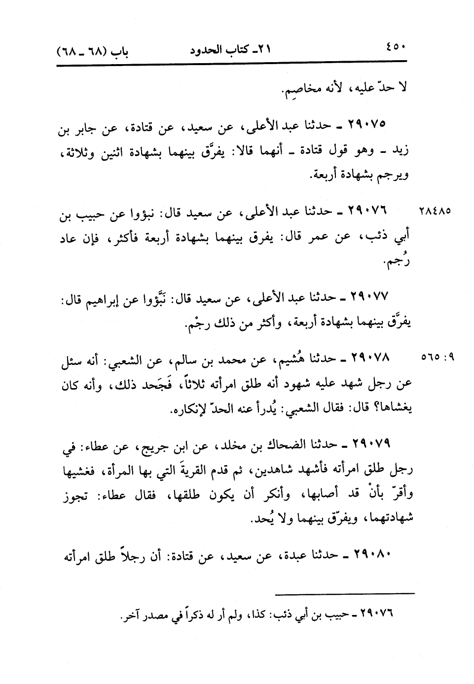 29078- حَدَّثَنَا هُشَيْمٌ ، عَنْ مُحَمَّدِ بْنِ سَالِمٍ ، عَنِ الشَّعْبِيِّ ؛ أَنَّهُ سُئِلَ عَنْ رَجُلٍ شَهِدَ عَلَيْهِ شُهُودٌ أَنَّهُ طَلَّقَ امْرَأَتَهُ ثَلاَثًا ، فَجَحَدَ ذَلِكَ ، وَأَنَّهُ كَانَ يَغْشَاهَا ؟ قَالَ : فَقَالَ الشَّعْبِيِّ : يُدْرَأُ عَنْهُ الْحَدُّ لإِنْكَارِهِ. (9/564).