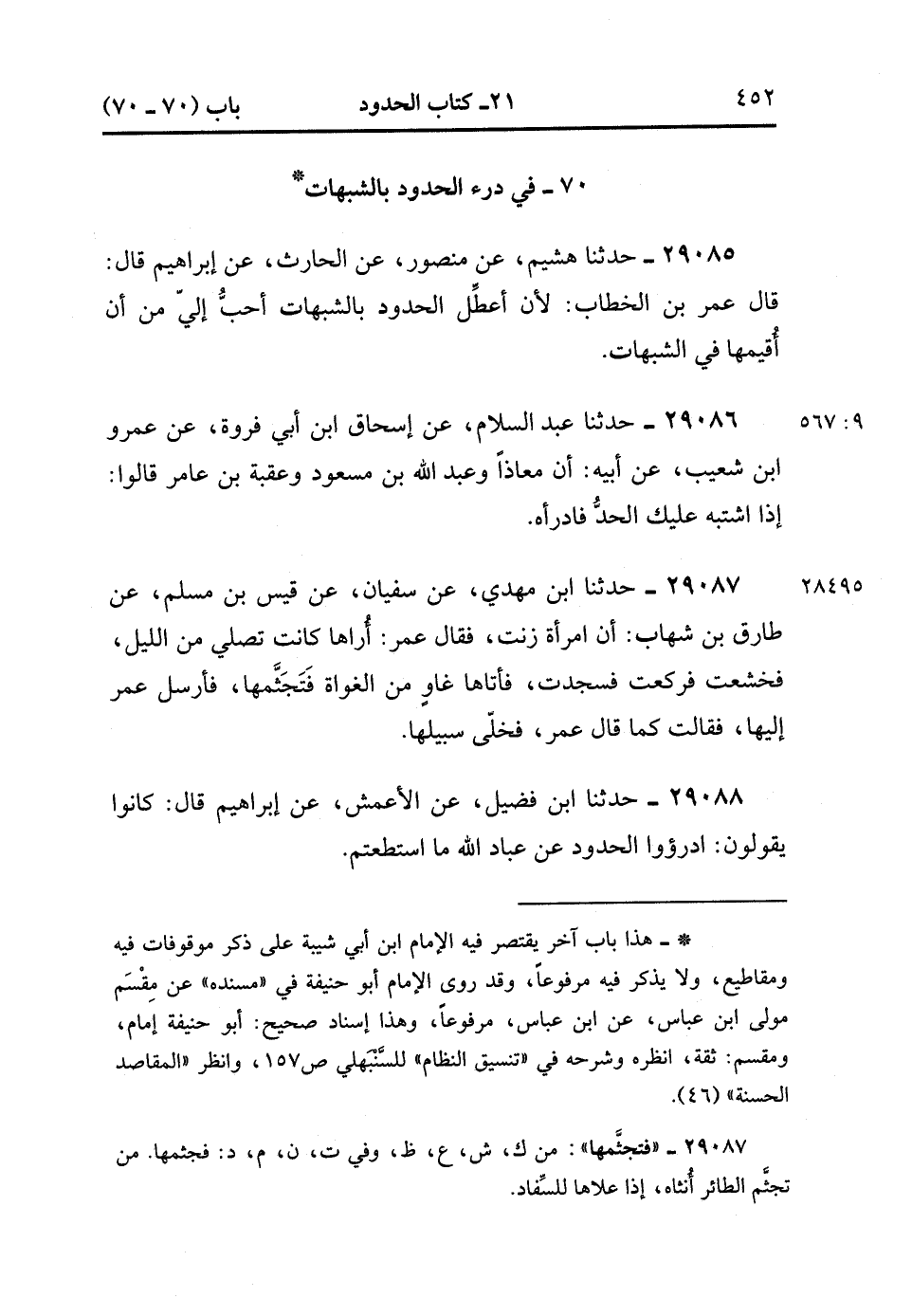 29088- حَدَّثَنَا ابْنُ فُضَيْلٍ ، عَنِ الأَعْمَشِ ، عَنْ إِبْرَاهِيمَ ، قَالَ : كَانُوا يَقُولُونَ ، ادْرَؤُوا الْحُدُودَ عَنْ عِبَادِ اللهِ مَا اسْتَطَعْتُمْ. (9/567).
