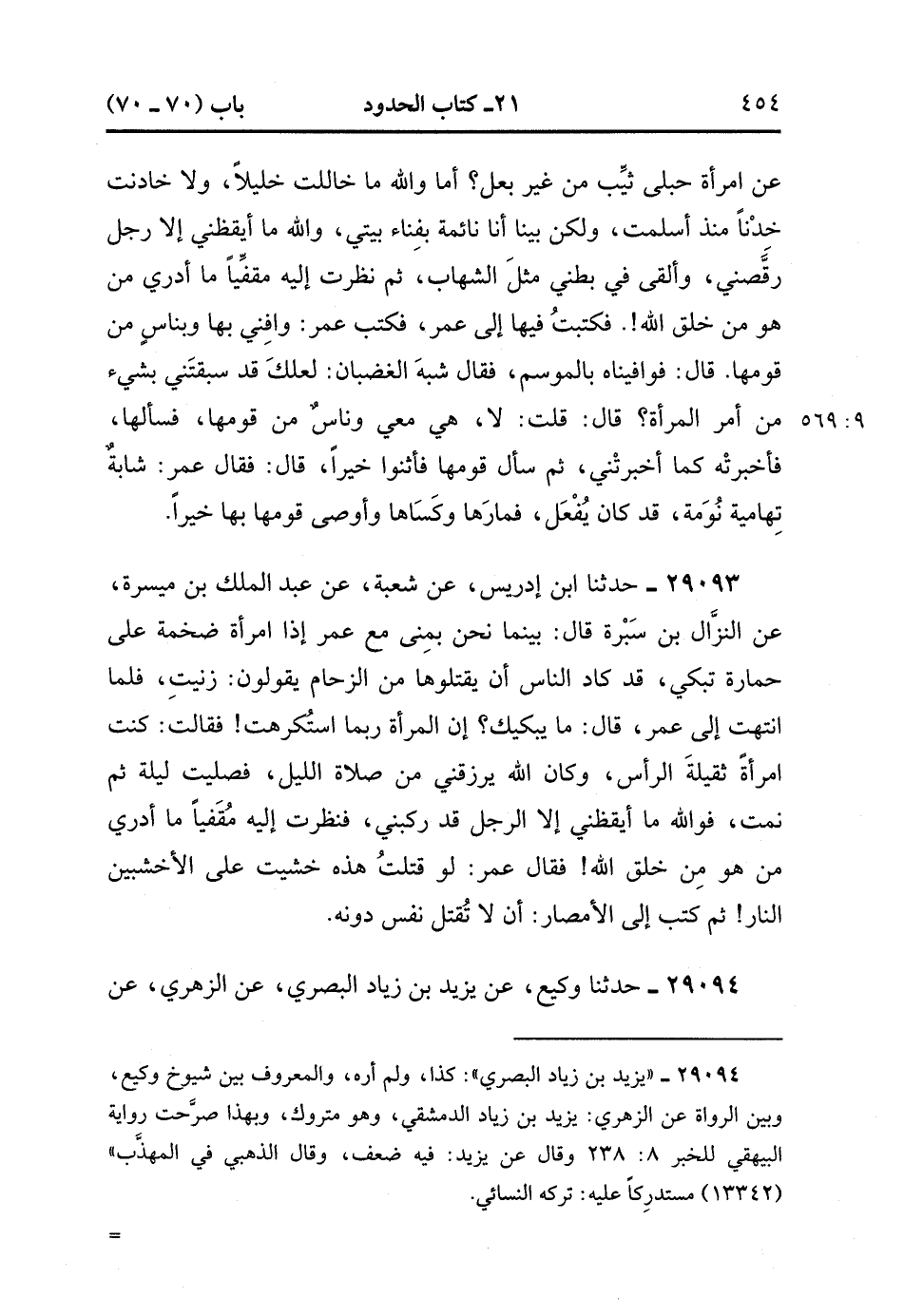 29093- حَدَّثَنَا ابْنُ إِدْرِيسَ ، عَنْ شُعْبَةَ ، عَنْ عَبْدِ الْمَلِكِ بْنِ مَيْسَرَةَ ، عَنِ النَّزَّالِ بْنِ سَبْرَةَ ، قَالَ : بَيْنَمَا نَحْنُ بِمِنًى مَعَ عُمَرَ ، إِذَا امْرَأَةٌ ضَخْمَةٌ عَلَى حِمَارَةٍ تَبْكِي ، قَدْ كَادَ النَّاسُ أَنْ يَقْتُلُوهَا مِنَ الزِّحَامِ ، يَقُولُونَ : زَنَيْتِ ، فَلَمَّا انْتَهَتْ إِلَى عُمَرَ ، قَالَ : مَا يُبْكِيكِ ؟ إِنَّ الْمَرأَة رُبَّمَا اسْتُكْرِهَتْ ، فَقَالَتْ : كُنْت امْرَأَةً ثَقِيلَةَ الرَّأْسِ ، وَكَانَ اللَّهُ يَرْزُقُنِي مِنْ صَلاَةِ اللَّيْلِ ، فَصَلَّيْتُ لَيْلَةً ثُمَّ نِمْتُ ، فَوَاللَّهِ مَا أَيْقَظَنِي إِلاَّ الرَّجُلُ قَدْ رَكِبَنِي ، فَنَظرتُ إِلَيْهِ مُقْفِيًا مَا أَدْرِي مَنْ هُوَ مِنْ خَلْقِ اللهِ ، فَقَالَ عُمَرُ : لَوْ قَتَلْتُ هَذِهِ خَشِيت عَلَى الأَخْشَبَيْنِ النَّارَ ، ثُمَّ كَتَبَ إِلَى الأَمْصَارِ : أَنْ لاَ تُقْتَلَ نَفْسٌ دُونَهُ. (9/569).