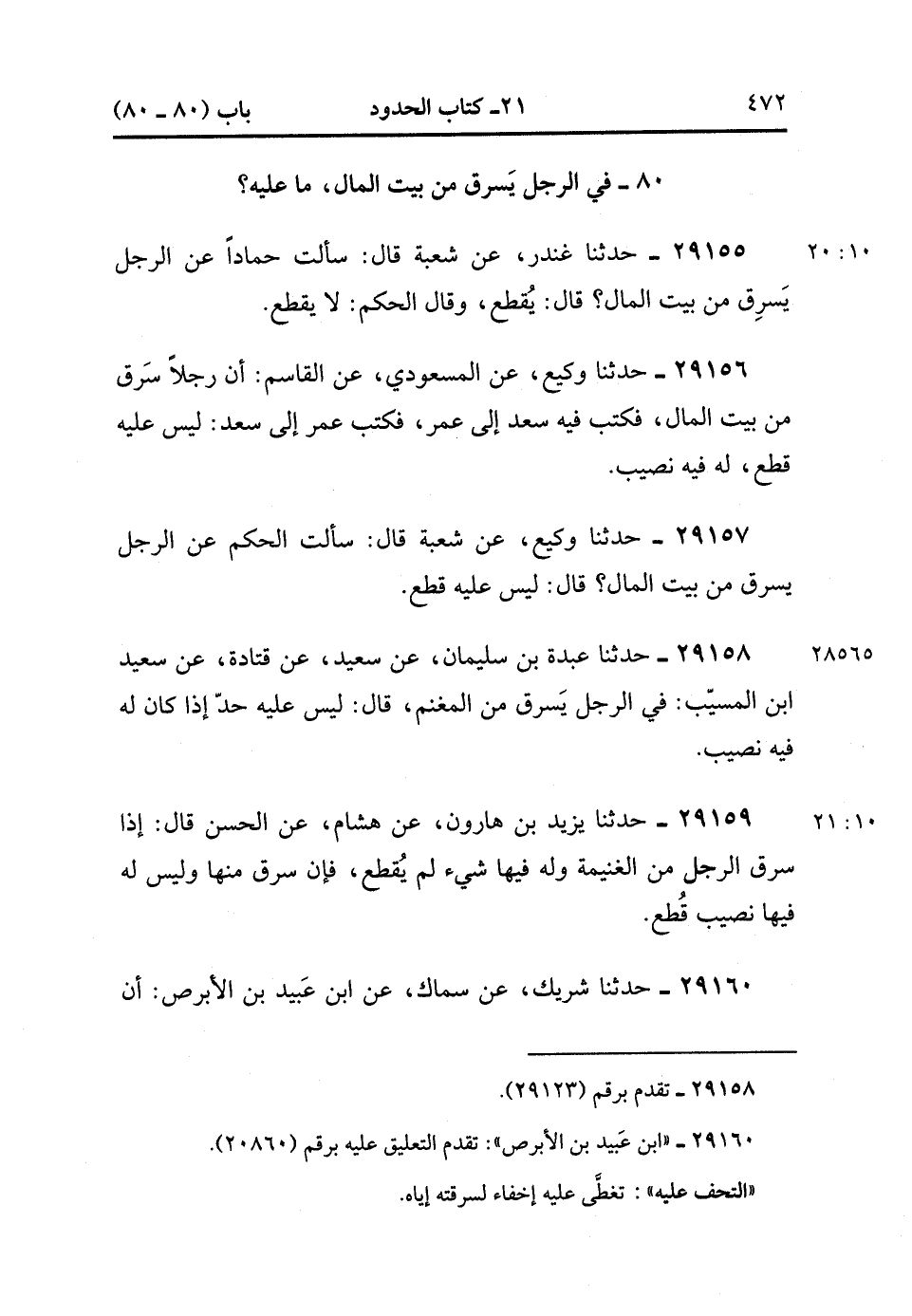 29157- حَدَّثَنَا وَكِيعٌ ، عَنْ شُعْبَةَ ، قَالَ : سَأَلْتُ الْحَكَمَ عن الرجل يَسْرِقُ مِنْ بَيْتِ الْمَالِ ؟ قَالَ : لَيْسَ عَلَيْهِ قَطْعٌ.