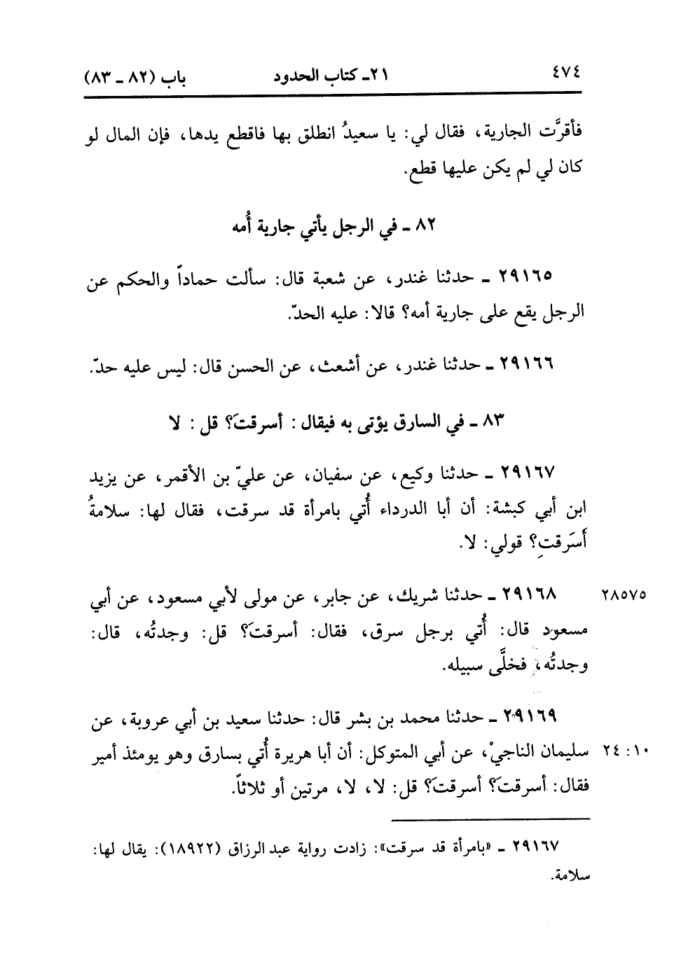 29169- حَدَّثَنَا مُحَمَّدُ بْنُ بِشْرٍ , قَالَ : حدَّثَنَا سَعِيدُ بْنُ أَبِي عَرُوبَةَ ، عَنْ سُلَيْمَانِ النَّاجِي ، عَنْ أَبِي الْمُتَوَكِّلِ ؛ أَنَّ أَبَا هُرَيْرَةَ أُتِيَ بِسَارِقٍ ، وَهُوَ يَوْمَئِذٍ أَمِيرٌ ، فَقَالَ : أَسَرَقْتَ ؟ أَسَرَقْتَ ؟ قُلْ : لاَ ، لاَ مَرَّتَيْنِ ، أَوْ ثَلاَثًا. (10/23).