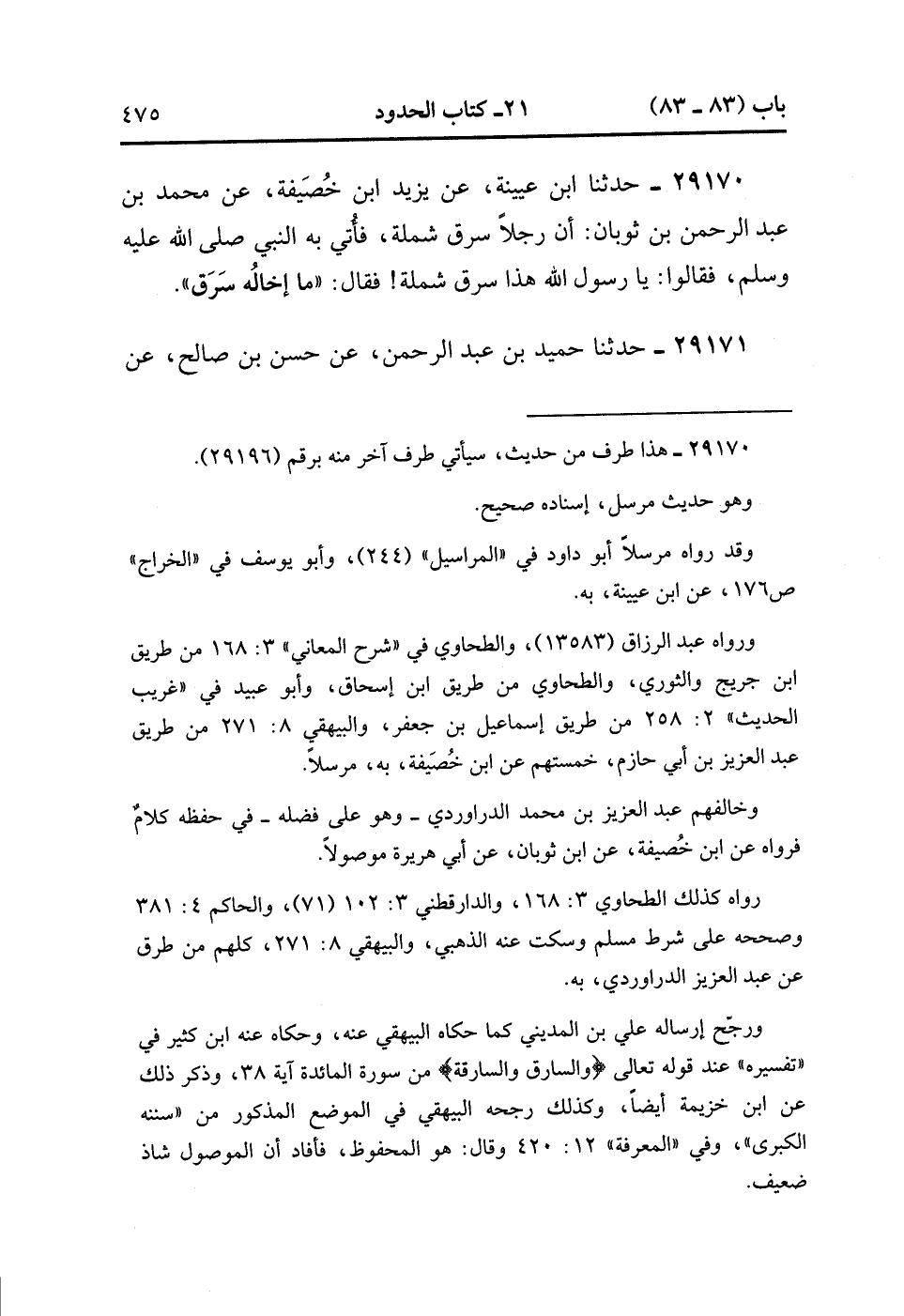29170- حَدَّثَنَا ابْنُ عُيَيْنَةَ ، عَنْ يَزِيدَ بْنِ خُصَيْفَةَ ، عَنْ مُحَمَّدِ بْنِ عَبْدِ الرَّحْمَنِ بْنِ ثَوْبَانَ ؛ أَنَّ رَجُلاً سَرَقَ شَمْلَةً ، فَأُتِيَ بِهِ النَّبِيُّ صَلَّى الله عَلَيْهِ وَسَلَّمَ ، فَقَالُوا : يَا رَسُولَ اللهِ ، هَذَا سَرَقَ شَمْلَةً ، فَقَالَ : مَا إِخَالَهُ سَرَقَ.