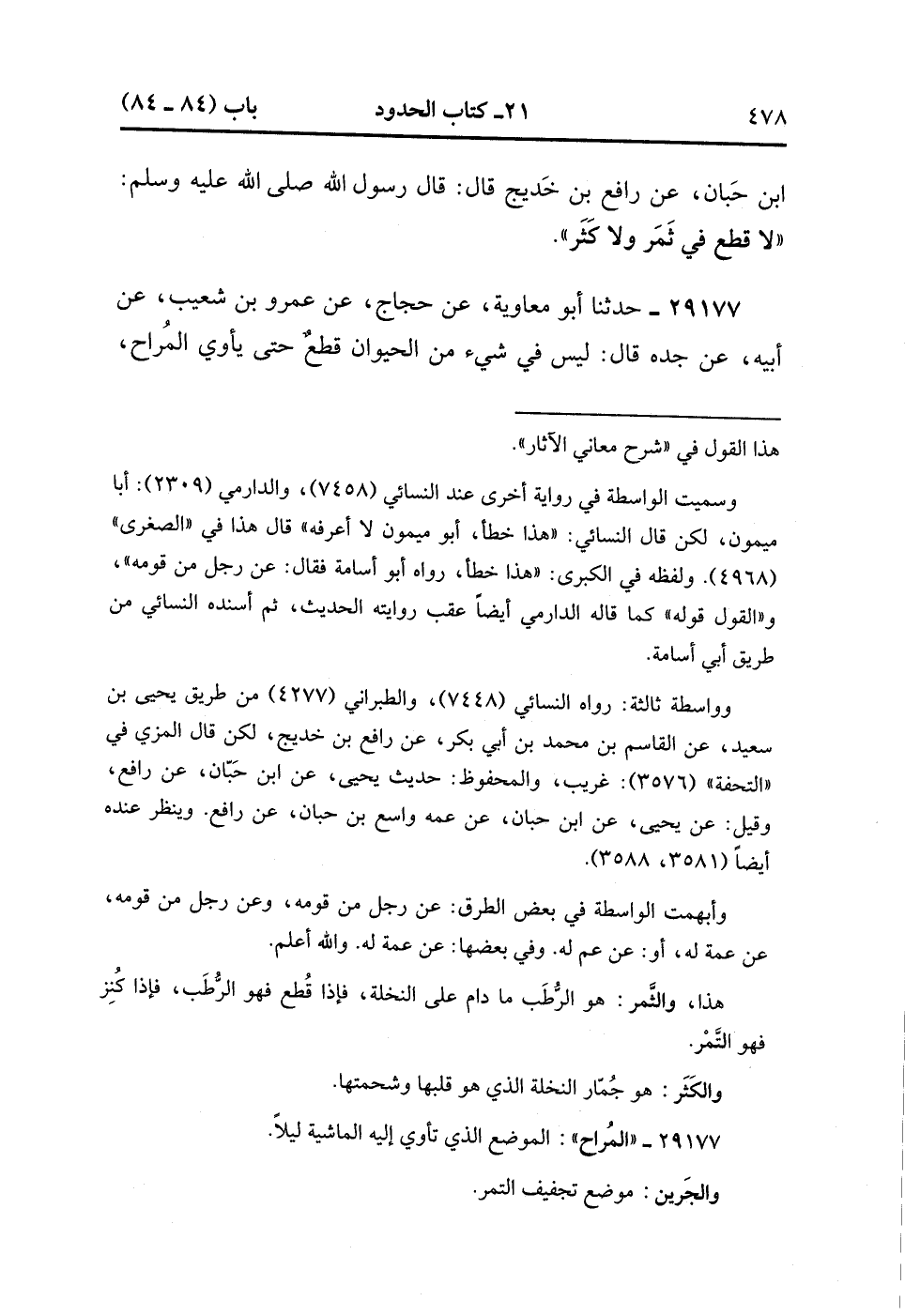 29177- حَدَّثَنَا أَبُو مُعَاوِيَةَ ، عَنْ حَجَّاجٍ ، عَنْ عَمْرِو بْنِ شُعَيْبٍ ، عَنْ أَبِيهِ ، عَنْ جَدِّهِ ، قَالَ : لَيْسَ فِي شَيْءٍ مِنَ الْحَيَوَانِ قَطْعٌ حَتَّى يَأْوِيَ الْمُرَاحَ ، وَلَيْسَ فِي شَيْءٍ مِنَ الثِّمَارِ قَطْعٌ حَتَّى يَأْوِيَ الْجَرِينَ. (10/26).