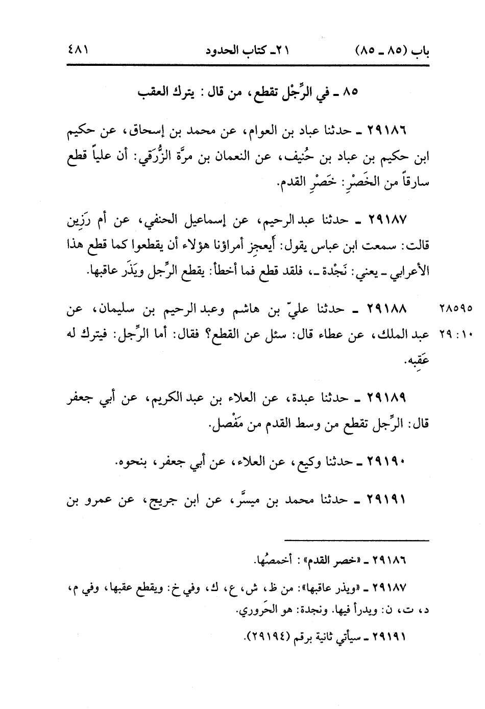 29189- حَدَّثَنَا عَبْدَةُ ، عَنِ الْعَلاَءِ بْنِ عَبْدِ الْكَرِيمِ ، عَنْ أَبِي جَعْفَرٍ ، قَالَ : الرِّجْلُ تُقْطَعُ مِنْ وَسَطِ الْقَدَمِ مِنْ مَفْصِلٍ.