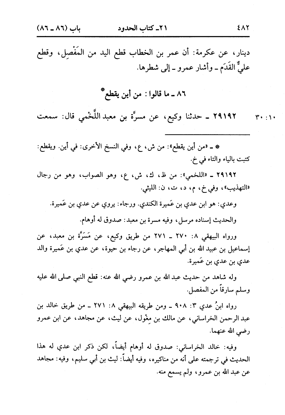 29192- حَدَّثَنَا وَكِيعٌ ، عَنْ مَسَرَّةَ بْنِ مَعْبَدٍ اللَّخْمِيِّ ، قَالَ : سَمِعْتُ عَدِيَّ بْنِ عَدِيٍّ يُحَدِّثُ ، عَنْ رَجَاءِ بْنِ حَيْوَةَ ؛ أَنَّ النَّبِيَّ صَلَّى الله عَلَيْهِ وَسَلَّمَ قَطَعَ رَجُلاً مِنَ الْمَفْصِلِ. (10/29).