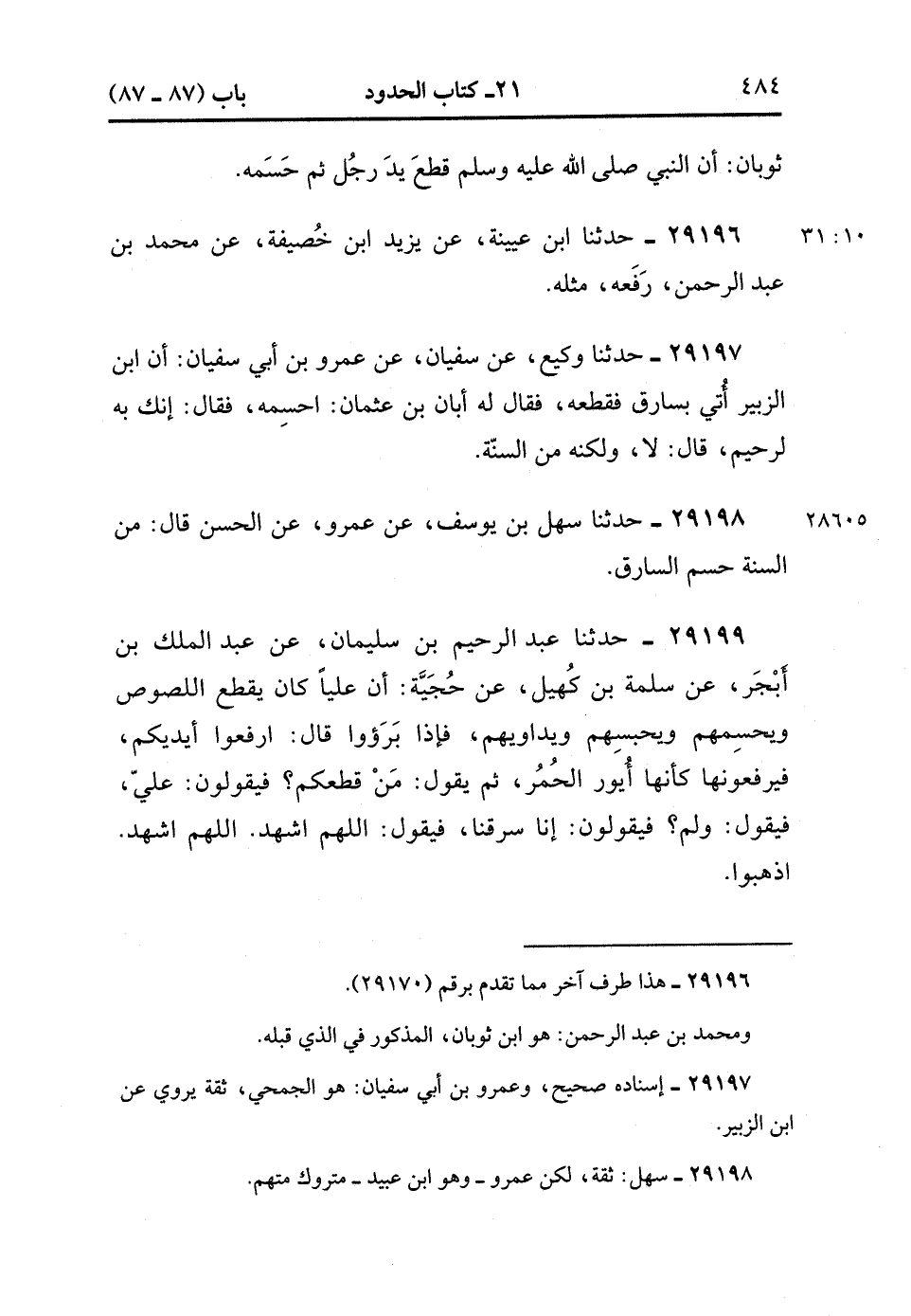 29199- حَدَّثَنَا عَبْدُ الرَّحِيمِ بْنُ سُلَيْمَانَ ، عَنْ عَبْدِ الْمَلِكِ بْنِ أَبْجَرَ ، عَنْ سَلَمَةَ بْنِ كُهَيْلٍ ، عَنْ حُجِّيَّةَ ؛ أَنَّ عَلِيًّا كَانَ يَقْطَعُ اللُّصُوصَ وَيَحْسِمُهُمْ وَيَحْبِسُهُمْ وَيُدَاوِيهِمْ ، فَإِذَا بَرَؤُوا ، قَالَ : أرْفَعُوا أَيْدِيَكُمْ ، فَيَرْفَعُونَهَا كَأَنَّهَا أُيُورُ الْحُمُرِ ، ثُمَّ يَقُولُ : مَنْ قَطَعَكُمْ ؟ فَيَقُولُونَ : عَلِيٌّ ، فَيَقُولُ : وَلِمَ ؟ فَيَقُولُونَ : إِنَّا سَرَقْنَا ، فَيَقُولُ : اللَّهُمَّ اشْهَدْ ، اللَّهُمَّ اشْهَدْ ، اذْهَبُوا. (10/31).