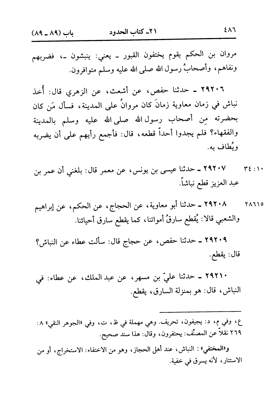 29206- حَدَّثَنَا حَفْصٌ ، عَنْ أَشْعَثَ ، عَنِ الزُّهْرِيِّ ، قَالَ : أُخِذَ نَبَّاشٌ فِي زَمَانِ مُعَاوِيَةَ ، زَمَانَ كَانَ مَرْوَانُ عَلَى الْمَدِينَةِ ، فَسَأَلَ مَنْ كَانَ بِحَضْرَتِهِ مِنْ أَصْحَابِ رَسُولِ اللهِ صَلَّى الله عَلَيْهِ وَسَلَّمَ بِالْمَدِينَةِ وَالْفُقَهَاءِ ؟ فَلَمْ يَجِدُوا أَحَدًا قَطَعَهُ ، قَالَ : فَأَجْمَعَ رَأْيُهُمْ عَلَى أَنْ يَضْرِبَهُ ، وَيُطَافَ بِهِ. (10/33).