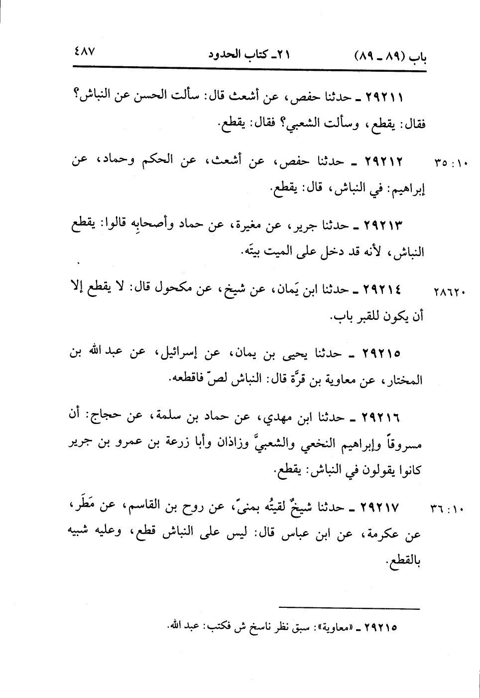 29216- حَدَّثَنَا ابْنُ مَهْدِيٍّ ، عَنْ حَمَّادِ بْنِ سَلَمَةَ ، عَنْ حَجَّاجٍ ؛ أَنَّ مَسْرُوقًا ، وَإِبْرَاهِيمَ النَّخَعِيّ ، وَالشَّعْبِيَّ ، وَزَاذَانَ ، وَأَبَا زُرْعَةَ بْنَ عَمْرِو بْنِ جَرِيرٍ ، كَانُوا يَقُولُونَ فِي النَّبَّاشِ : يُقْطَعُ.