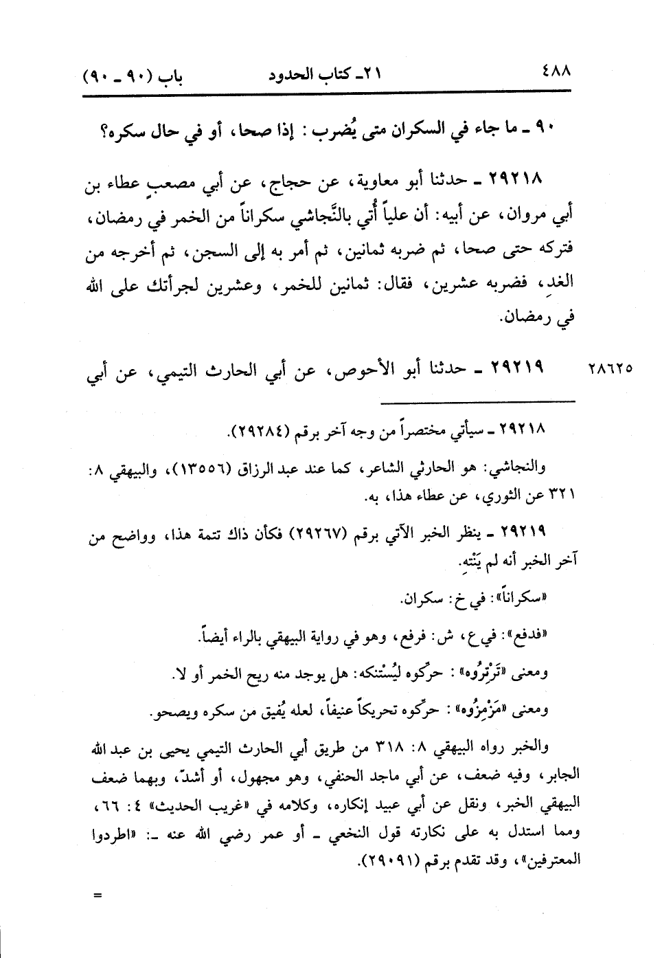 29219- حَدَّثَنَا أَبُو الأَحْوصِ ، عَنْ أَبِي الْحَارِثِ التَّيْمِيِّ ، عَنْ أَبِي مَاجِدٍ الْحَنَفِيِّ ، قَالَ : كُنْتُ عِنْدَ عَبْدِ اللهِ بْنِ مَسْعُودٍ قَاعِدًا ، فَجَاءَهُ رَجُلٌ مِنَ الْمُسْلِميَن بِابْنِ أَخٍ لَهُ ، فَقَالَ لَهُ : يَا أَبَا عَبْدِ الرَّحْمَنَ ، ابْنُ أَخِي وَجَدْتُهُ سَكْرَانًا ، فَقَالَ عَبْدُ اللهِ : تَرْتِرُوه ، وَمَزْمِزُوه ، وَاستُنْكِهُوه ، فَتُرْتِر ،وَمُزْمِز ، وَاستُنْكِه ، فَوُجِدَ سَكْرَانًا ، فَدُفِعَ إِلَى السِّجْنِ ، فَلَمَا كَانَ الْغَدُ ، جِئْتُ وَجِيءَ بِهِ. (10/36).