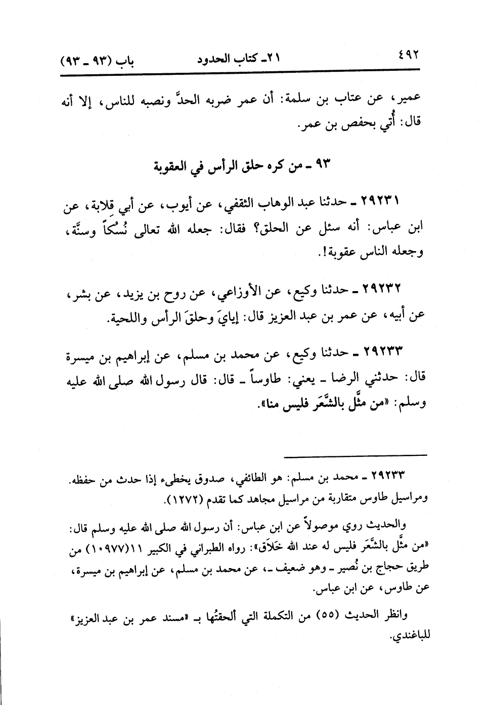 93- مَنْ كَرِهَ حَلْقَ الرَّأْسِ فِي الْعُقُوبَةِ.