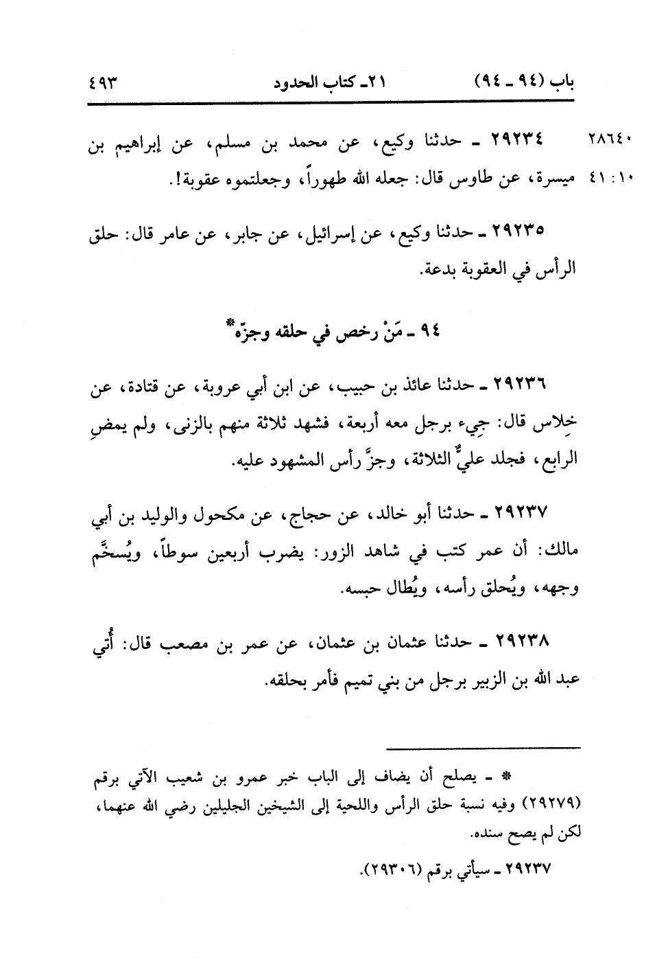 29237- حَدَّثَنَا أَبُو خَالِدٍ ، عَنْ حَجَّاجٍ ، عَنْ مَكْحُولٍ ، وَالْوَلِيدِ بْنِ أَبِي مَالِكٍ ؛ أَنَّ عُمَرَ كَتَبَ فِي شَاهِدِ الزُّورِ : يُضْرَبُ أَرْبَعِينَ سَوْطًا ، وَيُسَخَّمُ وَجْهُهُ ، وَيُحْلَقُ رَأْسُهُ ، وَيُطَالُ حَبْسُهُ.