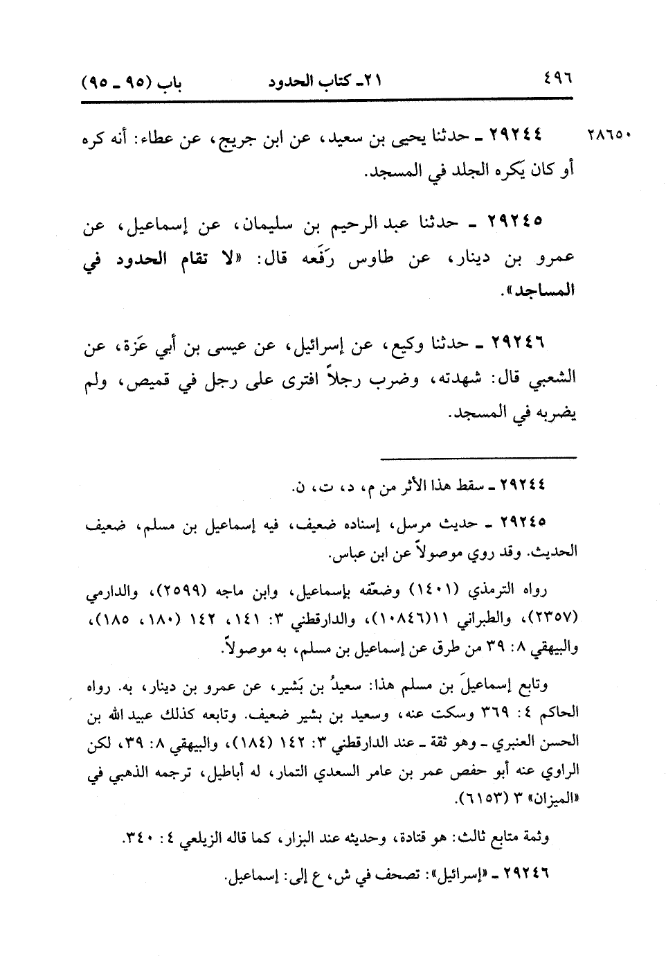 29245- حَدَّثَنَا عَبْدُ الرَّحِيمِ بْنُ سُلَيْمَانَ ، عَنْ إِسْمَاعِيلَ ، عَنْ عَمْرِو بْنِ دِينَارٍ ، عَنْ طَاوُوسٍ ، رَفَعَهُ ، قَالَ : لاَ تُقَامُ الْحُدُودُ فِي الْمَسَاجِدِ.