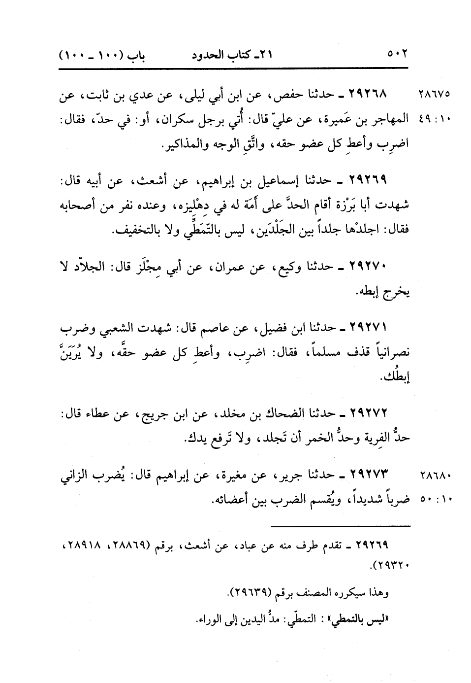 29273- حَدَّثَنَا جَرِيرٌ ، عَنْ مُغِيرَةَ ، عَنْ إِبْرَاهِيمَ ، قَالَ : يُضْرَبُ الزَّانِي ضَرْبًا شَدِيدًا ، وَيُقَسَّمُ الضَّرْبُ بَيْنَ أَعْضَائِهِ. (10/50).