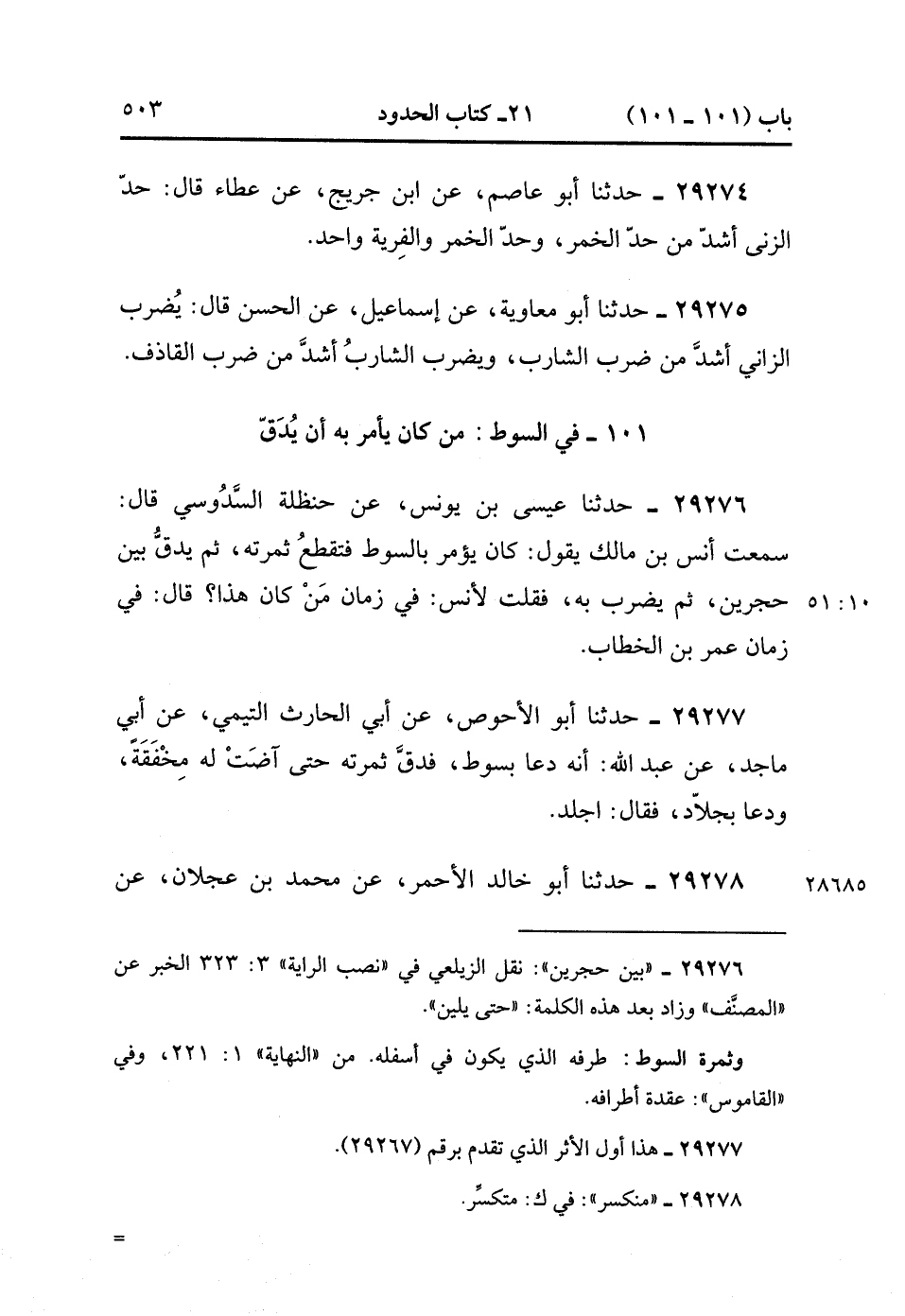 29276- حَدَّثَنَا عِيسَى بْنُ يُونُسَ ، عَنْ حَنْظَلَةَ السَّدُوسِيِّ ، قَالَ : سَمِعْتُ أَنَسَ بْنَ مَالِكٍ ، يَقُولُ : كَانَ يُؤْمَرُ بِالسَّوْطِ ، فَتُقْطَعُ ثَمَرَتُهُ ، ثُمَّ يُدَقُّ بَيْنَ حَجَرَيْنِ ، ثُمَّ يُضْرَبَ بِهِ ، فَقُلْتُ لأَنَسٍ : فِي زَمَانِ مَنْ كَانَ هَذَا ؟ قَالَ : فِي زَمَانِ عُمَرَ بْنِ الْخَطَّابِ. (10/50).