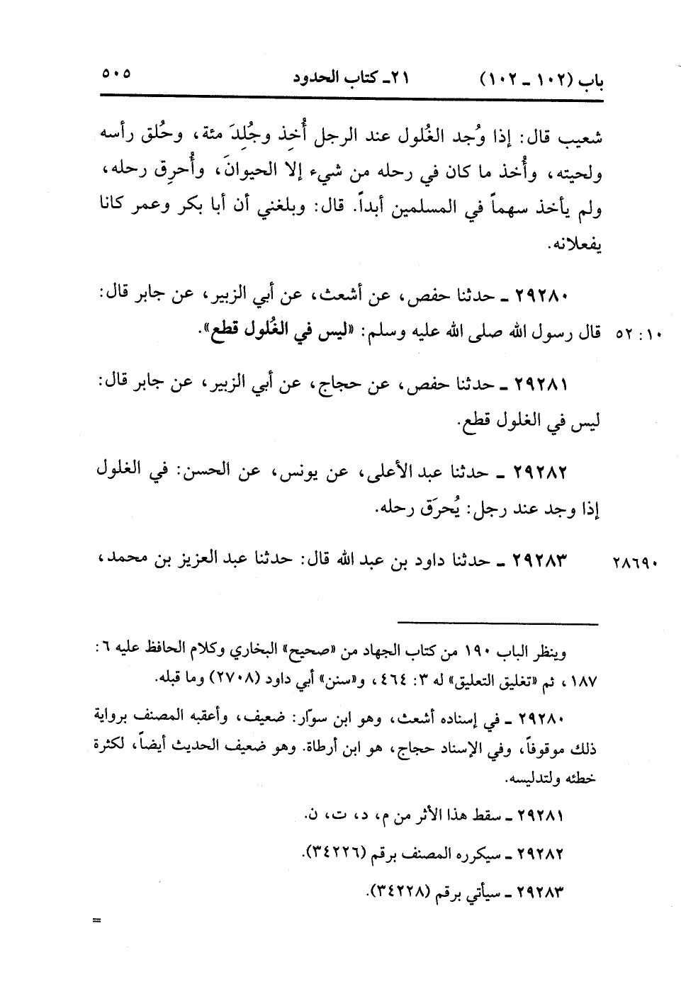29280- حَدَّثَنَا حَفْصٌ ، عَنْ أَشْعَثَ ، عَنْ أَبِي الزُّبَيْرِ ، عَنْ جَابِرٍ ، قَالَ : قَالَ رَسُولُ اللهِ صَلَّى الله عَلَيْهِ وَسَلَّمَ : لَيْسَ فِي الْغُلُولِ قَطْعٌ. (10/51).
