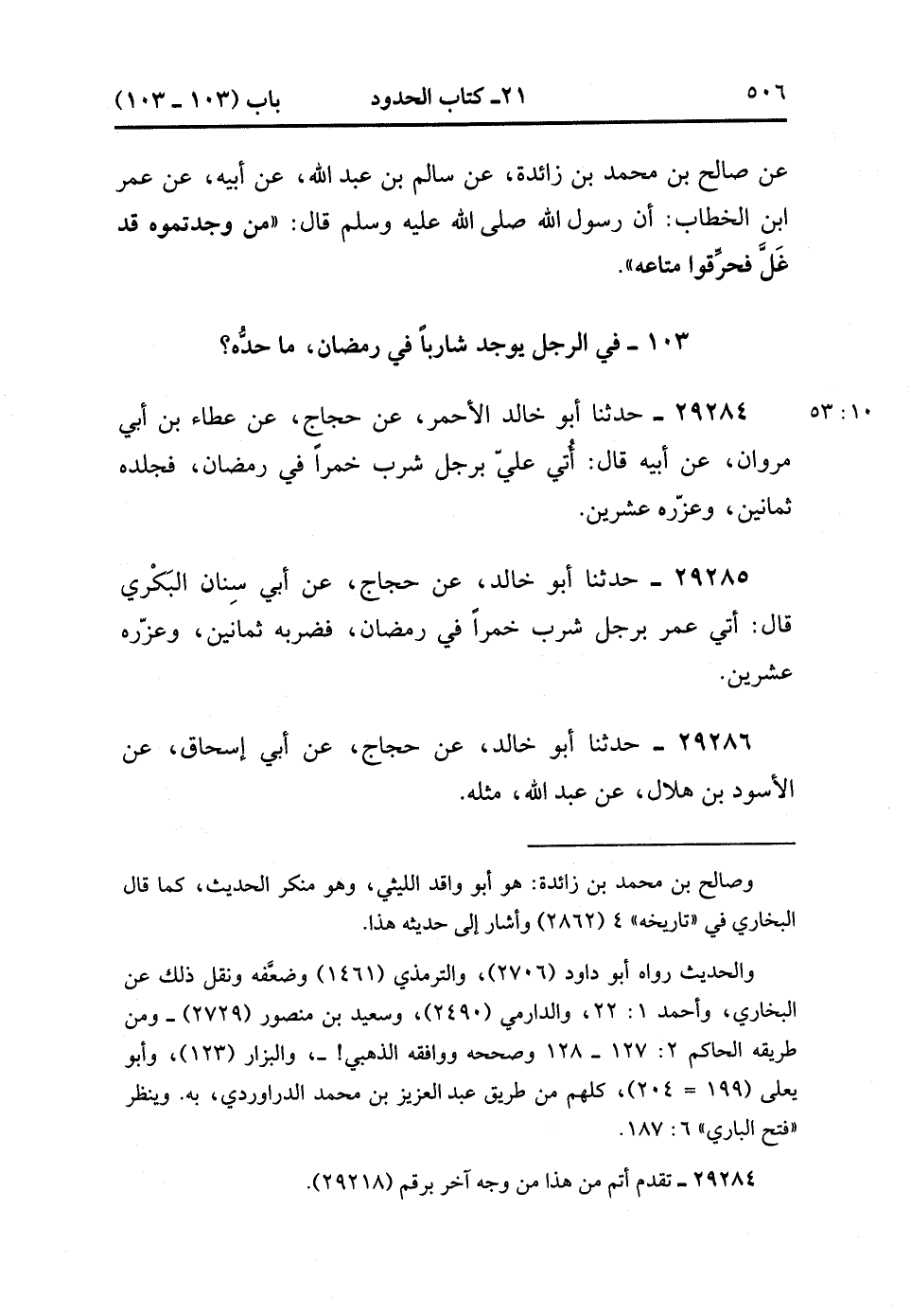 29285- حَدَّثَنَا أَبُو خَالِدٍ ، عَنْ حَجَّاجٍ ، عَنْ أَبِي سِنَانٍ الْبَكْرِيِّ ، قَالَ : أُتِيَ عُمَرُ بِرَجُلٍ شَرِبَ خَمْرًا فِي رَمَضَانَ ، فَضَرَبَهُ ثَمَانِينَ ، وَعَزَّرَهُ عِشْرِينَ.