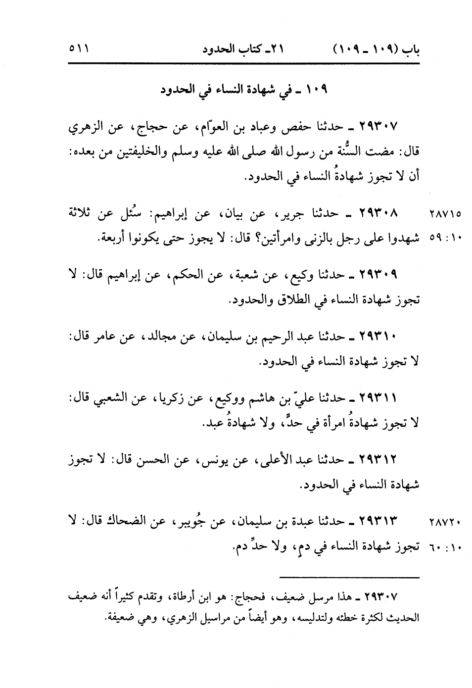 29307- حَدَّثَنَا حَفْصٌ ، وَعَبَّادُ بْنُ الْعَوَّامِ ، عَنْ حَجَّاجٍ ، عَنِ الزُّهْرِيِّ ، قَالَ : مَضَتِ السُّنَّةُ مِنْ رَسُولِ اللهِ صَلَّى الله عَلَيْهِ وَسَلَّمَ وَالْخَلِيفَتَيْنِ مِنْ بَعْدِهِ ، أَنْ لاَ تَجُوزَ شَهَادَةُ النِّسَاءِ فِي الْحُدُودِ. (10/58).